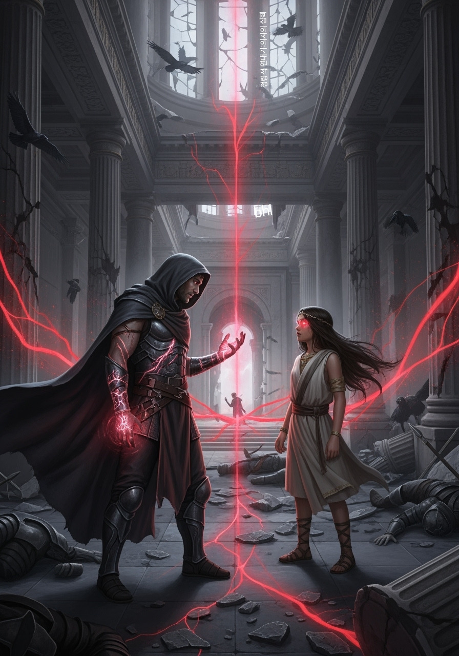 그의 손바닥에는 아직 말라붙지 않은 피가 고여 있었고, 그 피는 붉은 문자처럼 손금 위에서 빛을 발하고 있었다. 신전의 결계는 그의 접근을 감지하고 요동쳤고, 하늘에서는 까마귀 떼가 몰려들어 비명을 질렀다.
