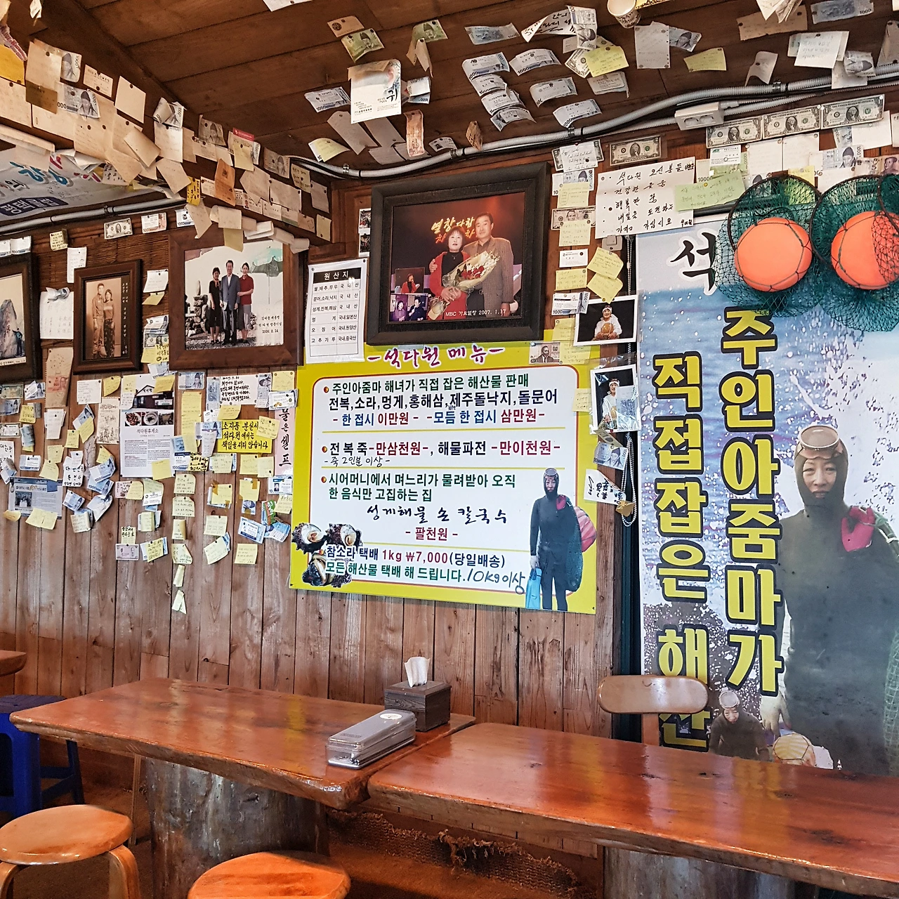 제주의 젊은 여인은 18세가 되면 뭍으로 떠나거나, 직업 해녀가 된단다. (물론 더 많은 직업도 있겠다.) 주인 해녀아주머니도 직접 물질로 싱싱한 재료를 대시는데, 18세에 우도에서 자라 해녀가 되셨고, 그 전 부터 동쪽 앞바다를 놀이터 삼아 지내셨다고 한다. 해녀는 각자의 물질 구역이 정해지는데 터를 잡고 사는 동네 기준이란다. 아무리 옆 구역의 자연 생산량이 좋아도 넘보지 않고 넘볼 수 없는 그런 합의가 있는 것이다. 해녀아주머니의 구수한 제주도 사투리를 들으며 여유로운 아침 식사시간을 보낸다. 시골 식당안의 벽은 이곳을 다녀간 손님들의 행운과 감사의 표식들과 해녀 아주머니와 바깥어르신의 젊은 시절 흑백사진부터 최근의 사진까지 한 세월을 말하듯 채워져있다.