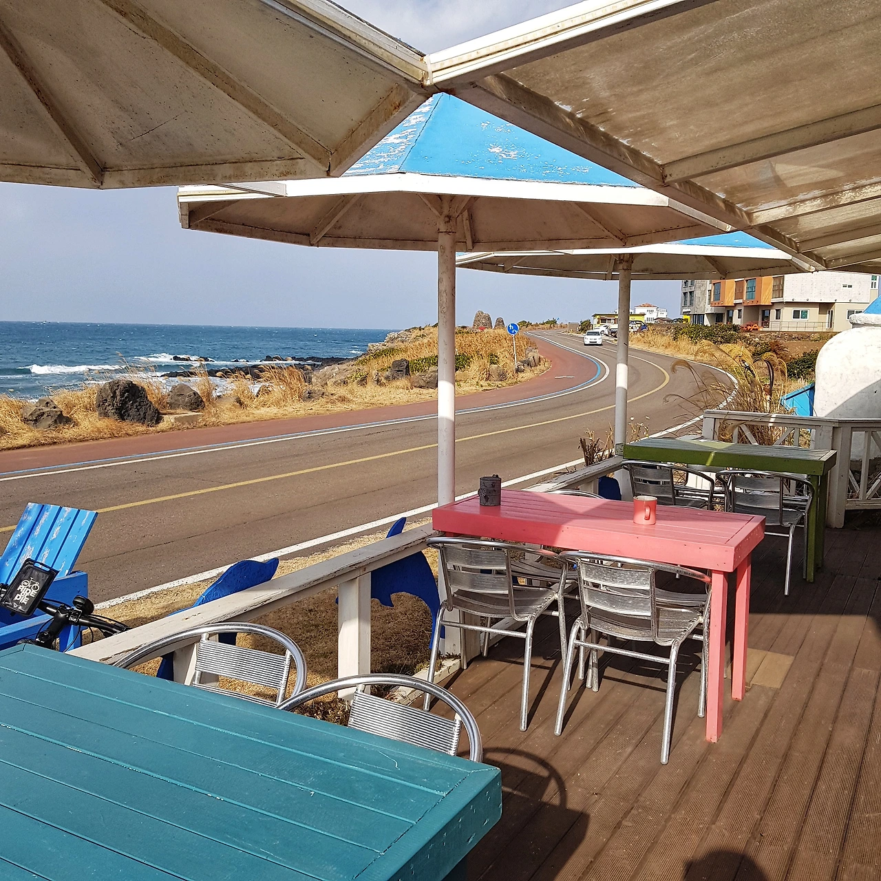 섬을 날려버릴 듯한 세찬 바람이 밤 새도록 불었다. 그 옛날 부터 제주도민들은 이런 밤의 소리에 익숙해져 있을 것이다. 두어번 잠에서 깬 후, 조용해진 구좌읍의 아침나절 잠으로 개운한 아침을 맞이한다. 하늘엔 구름 한점이 없다. 저리도 파란하늘과 파란바다가 있을까? 그것도 한자리 한시에.