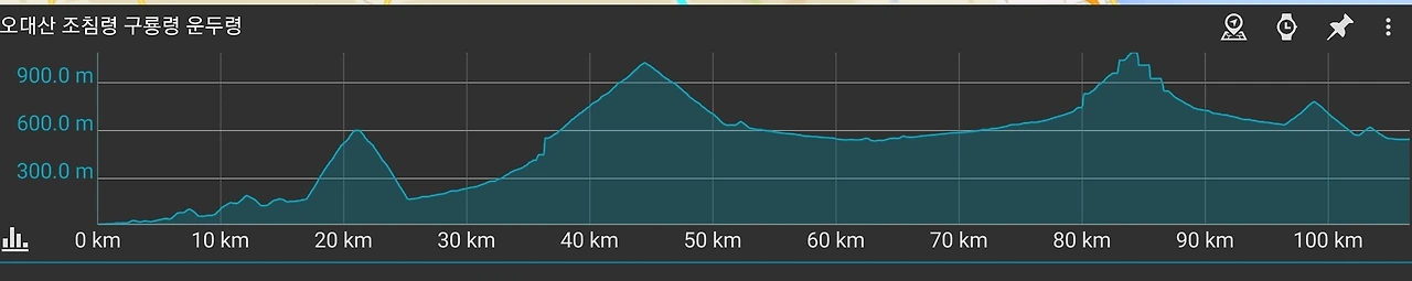 양양(좌측)에서 진부까지 고도변화. 3 개령 중 두번째 구룡령. 10km가량 이어지는 업힐