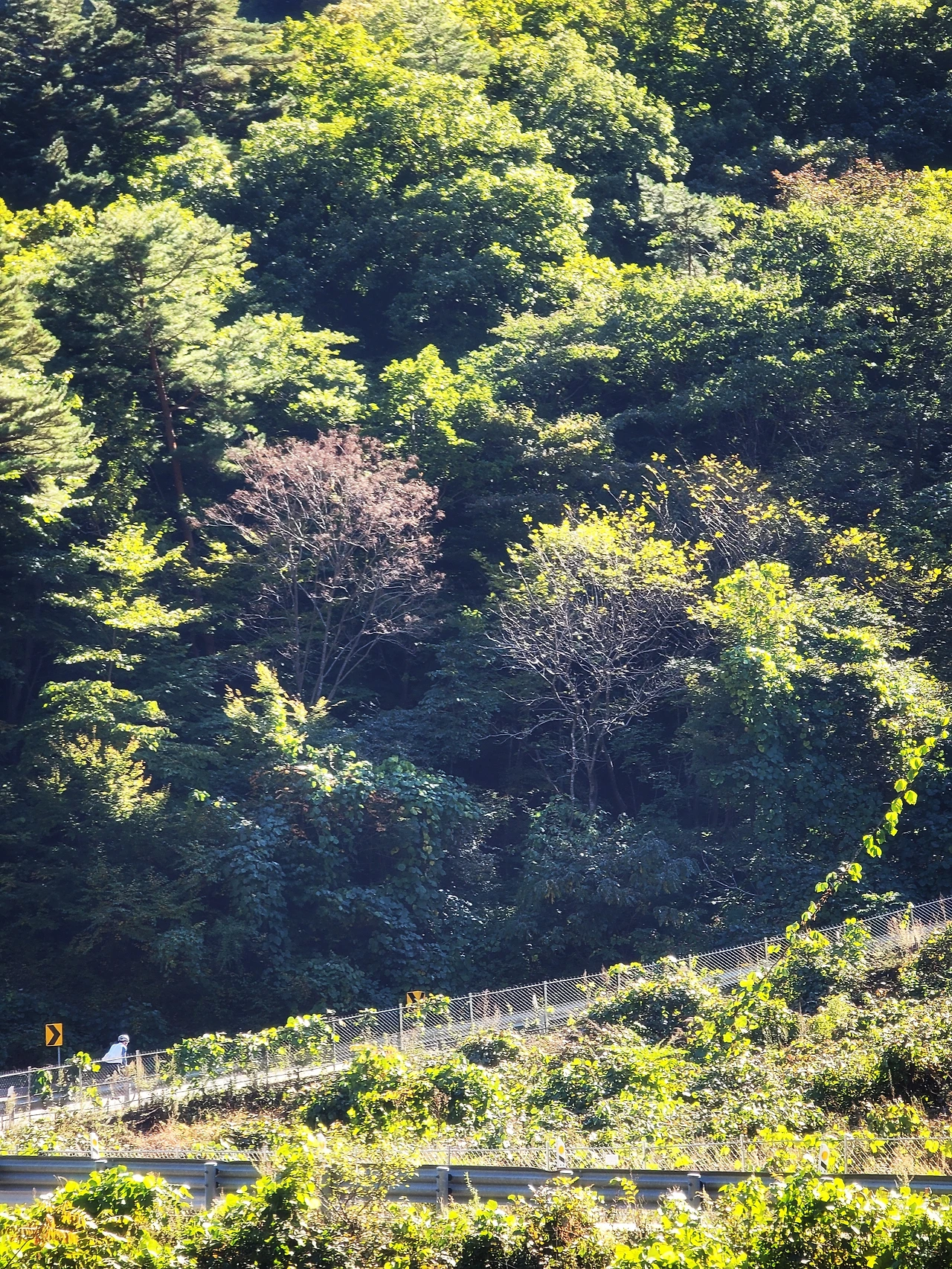반복되는 주문에 멍해질 때 즈음이면 후반부 2.1km에 접어드는데, 지그재그 헤어핀 도로가 시작된다. 경사는 전반부보다는 덜 사나운 편(8.7%)이지만 숫자가 그렇다는 것일 뿐 두 다리에는 큰 의미는 없는 듯하다. 매번 코너를 돌 때마다 저 코너만 돌면 금방이라도 조침령 터널이 보일 것 같지만, 다시 주문을 외운다.