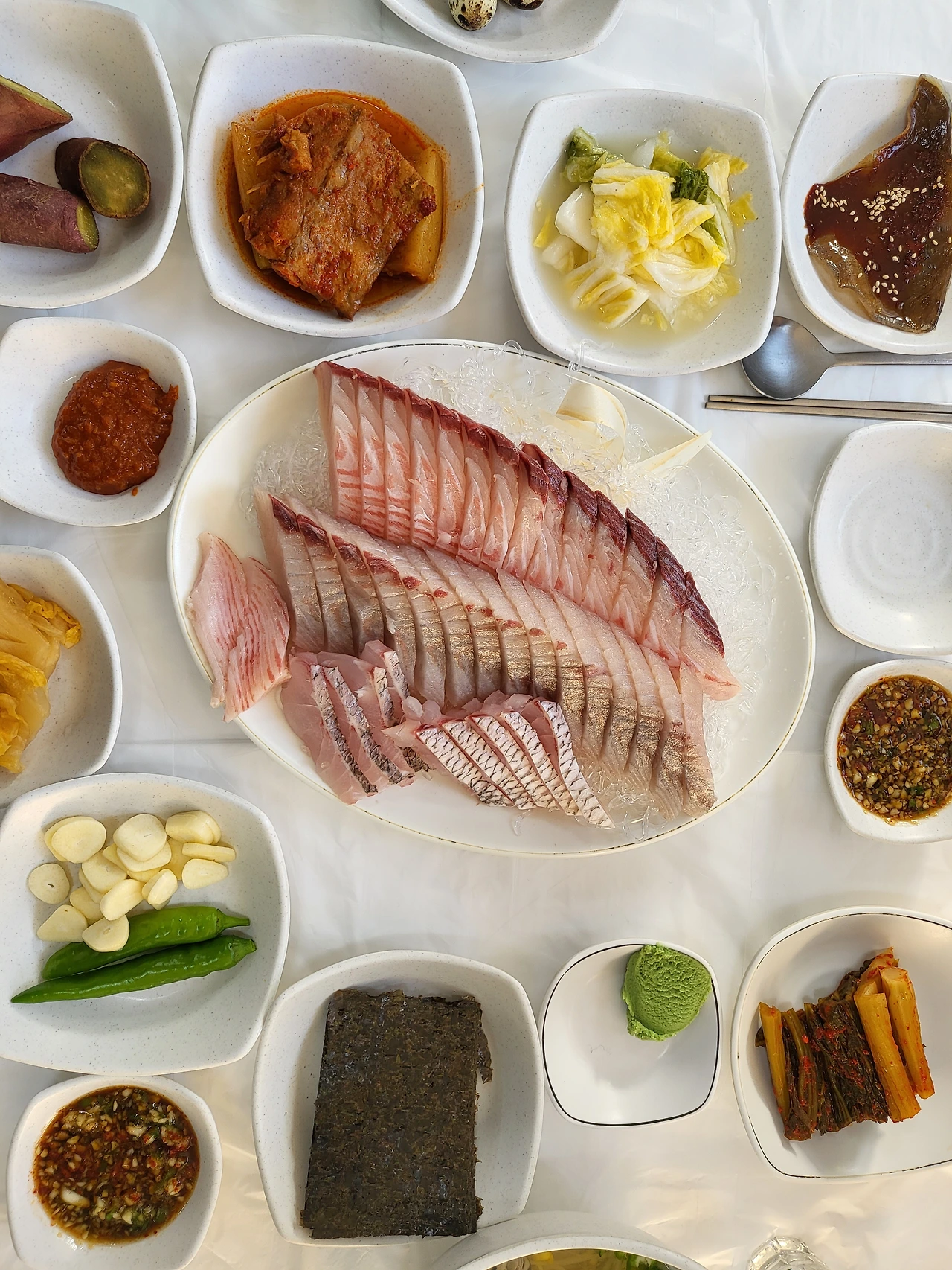 삼치와 민어 선어회. 사진 좌측 구석의 간장 소스와 묵은지, 여수 돌산 특산물 갓김치, 생김의 조합은 지금도 잊지 못할 맛이다.
