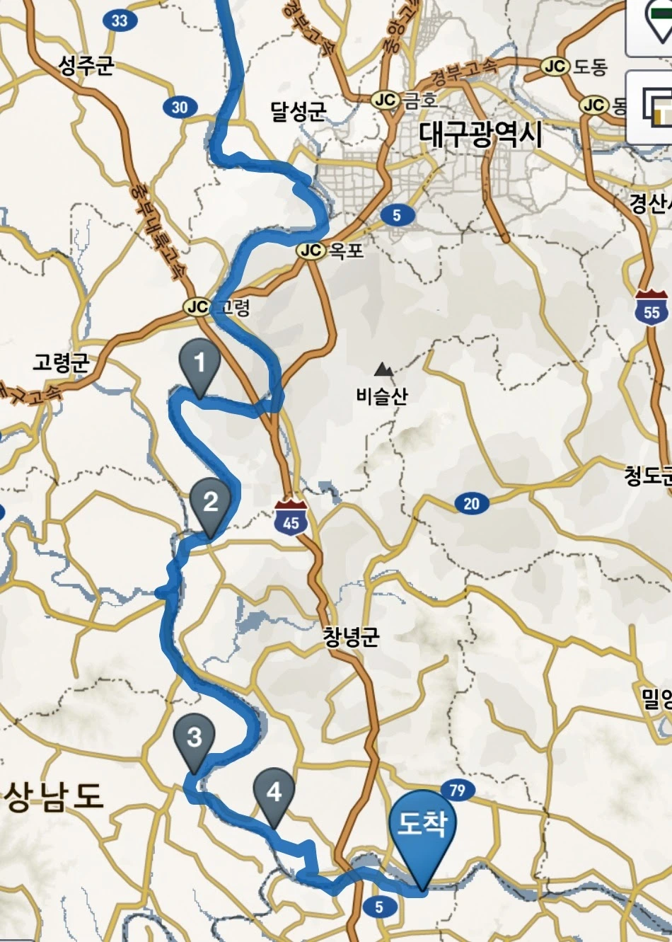 구미보와 칠곡보까지는 자전거도로가 비교적 평탄하고 잘 구성되어 있고, 구미의 산업단지를 지나는 길은, 훌륭한 수준까지는 못 미치더라도 분주하게 내달리는 산업용 트럭들로 부터 안전하게 라이딩을 할 수 있다. 낙단보에서 구미보 - 칠곡보 - 강정고령보 - 달성보까지이어지는 100여 킬로미터의 자전거길은 그리 인상 깊이 남는 곳은 없다. 물론, 육체적 정신적 한계와 싸우는 난코스라는 측면에서 그렇다는 것이다. 오늘의 도전은 그 다음 구간(달성보~합천창녕보) 부터다.
