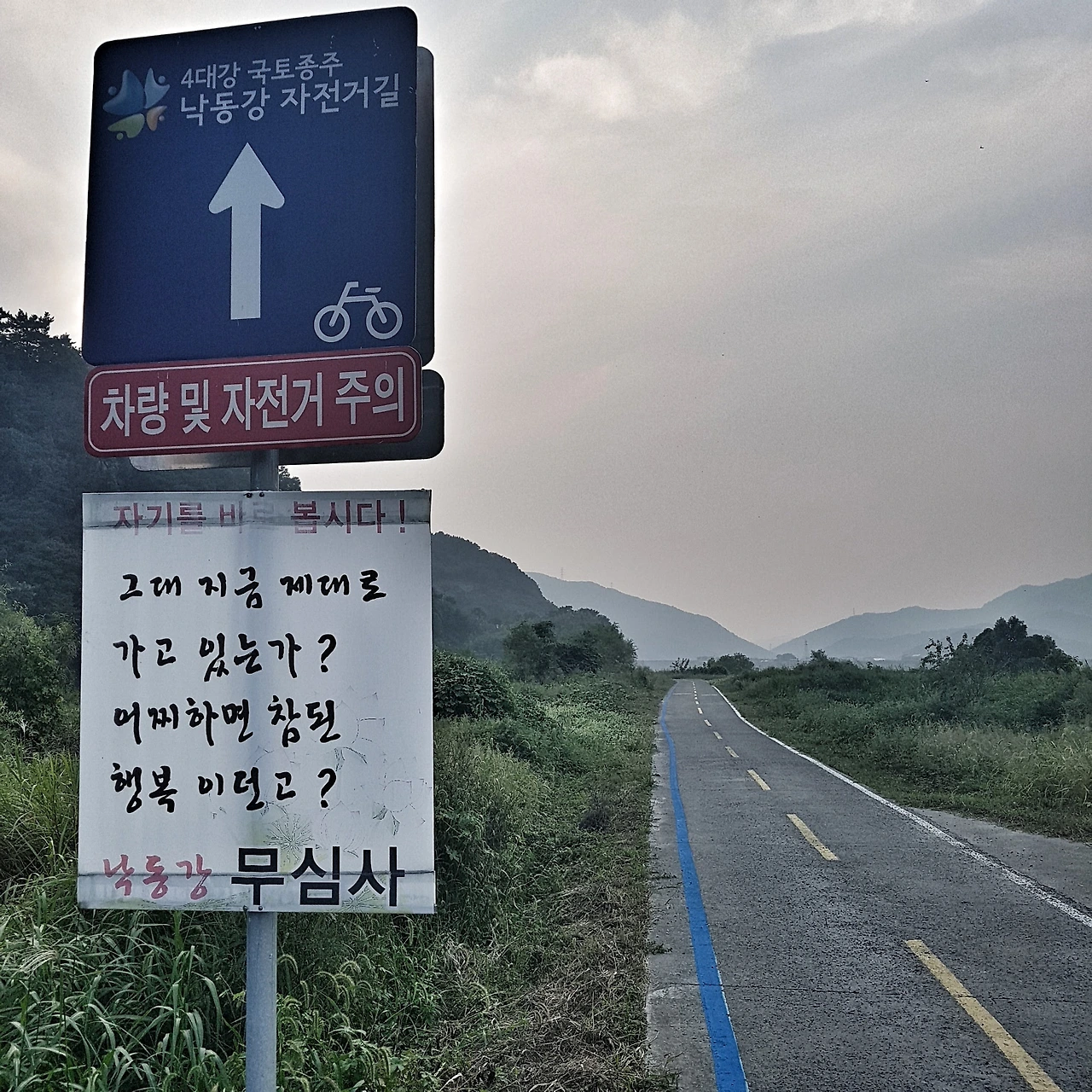 거친 고갯길들과의 일전에 쓸 체력과 시간을 아끼기 위해, 오늘 아침도 가능한한 국도를 활용해 라이딩하기로 한다. 낙단보를 지나는 "도안로"를 활용하여 "도개면"을 지나 "도개리(이곳에서 자전거도로로 옮겨 타야 한다)" 까지 7.5킬로미터를 효율적으로 라이딩 할 수 있었다. 가뿐하게 시작은 했지만, 몸 구석구석 찾아든 피로감은 어쩔 수 없는 것이다. 오른쪽 고관절 쪽에 통증이 시작되었지만 라이딩을 하다보면 가라앉길 기대하며 계속 페달링을 이어간다.