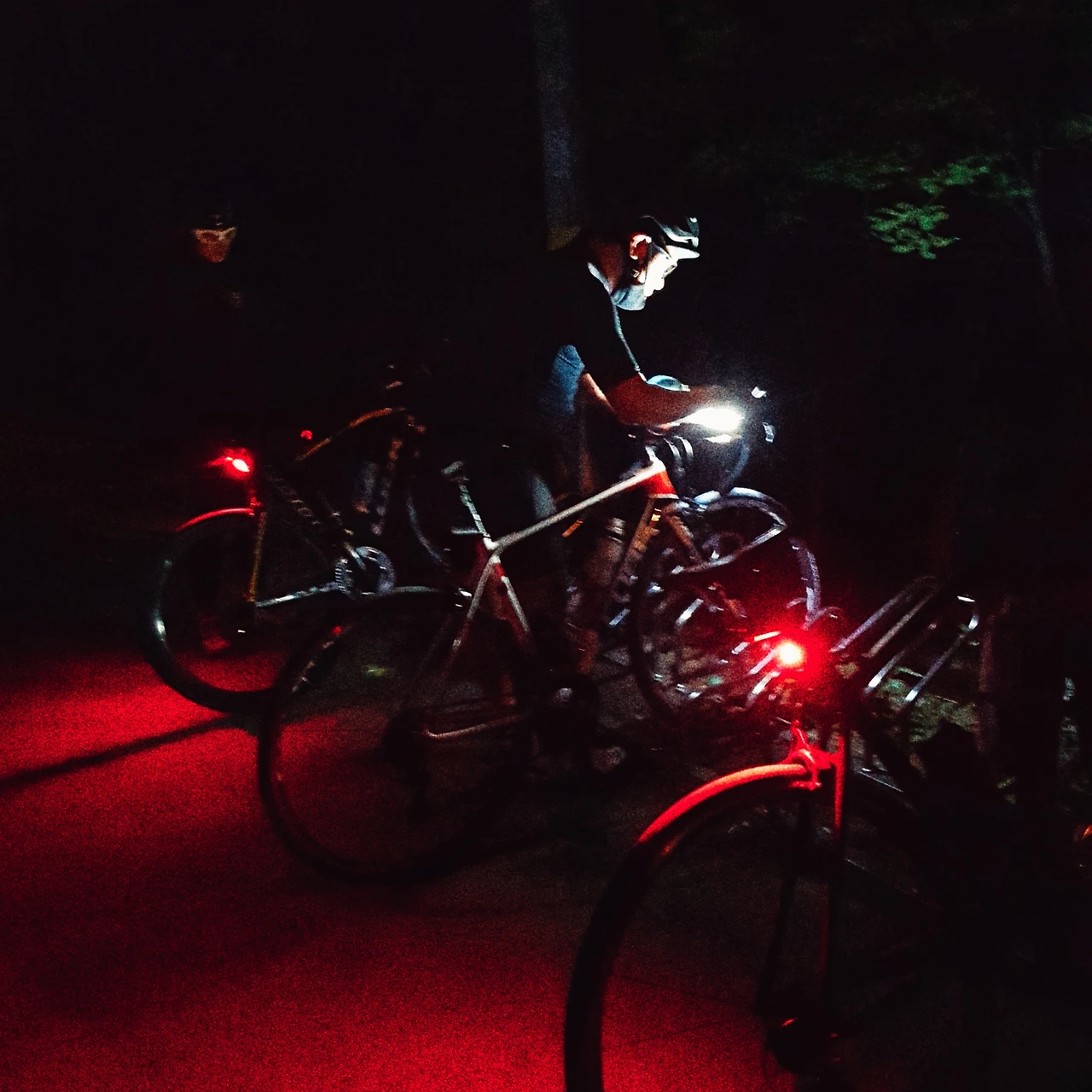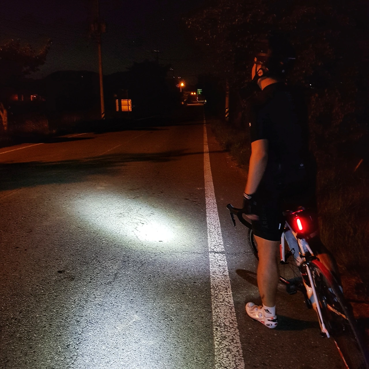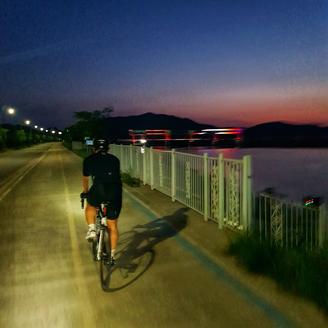 이제부턴 칠흙같은 어둠이다. 인적이 없는 숲이나 강변을 달릴때는 우리 셋의 전조등과 빨간 후미등만이 유일한 의지가 된다. 고백하자면, 혼자서는 달리지 못했을 법한 어둠이자 음산한 느낌마저 든다. 휙하고 전조등 앞을 가로지르는 고라니(고라니라 믿는다), 길 한쪽 구석에 웅크린 들고양이, 그 외엔 보이지 않는다. 다행히도, 맑은 밤하늘의 만월이 좌측이 숲, 우측이 강일것이라 알려주지만, 확신은 못한다.