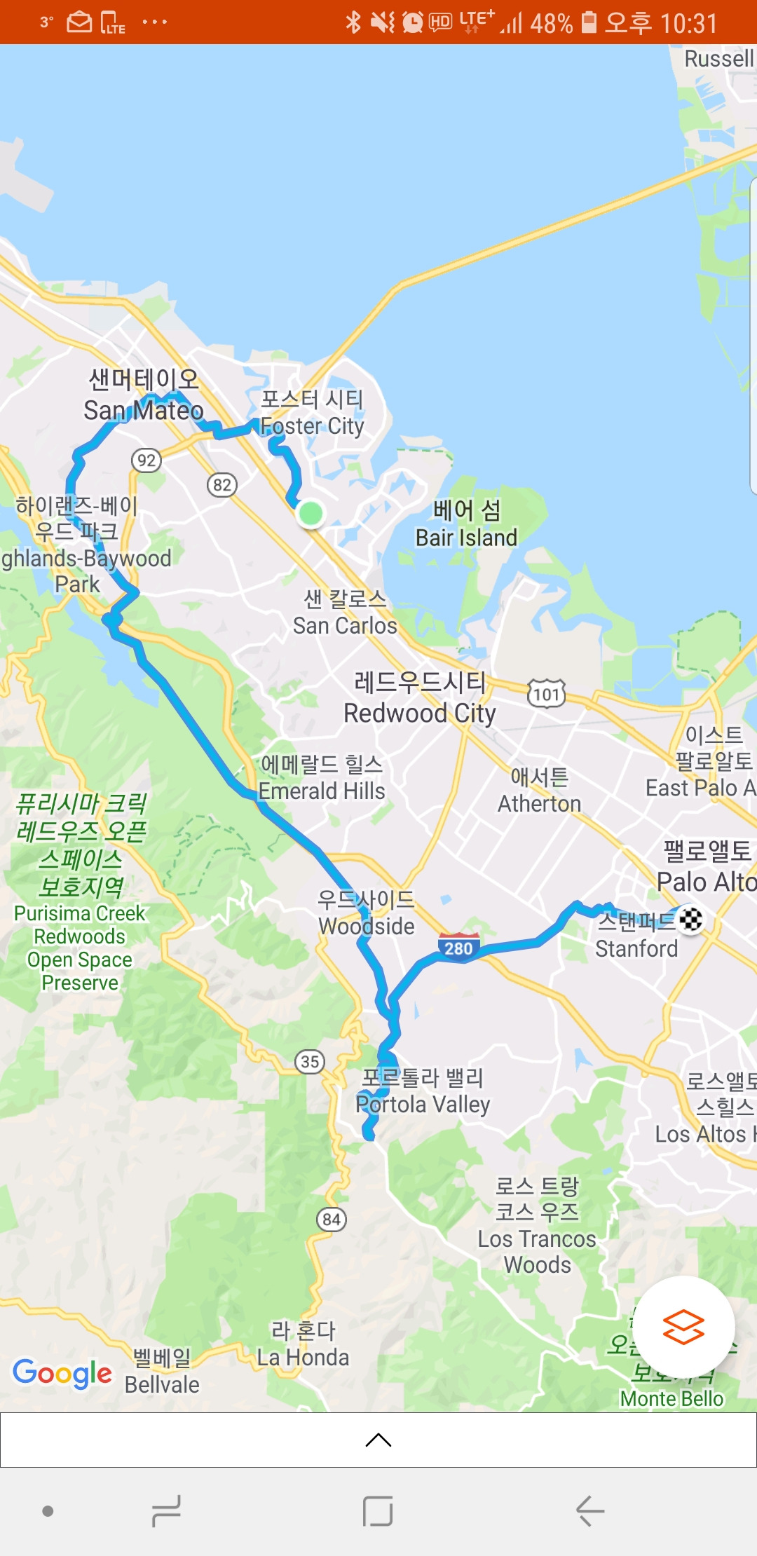 오늘의 코스는 호텔이 위치한 Foster(포스터) 시티의 물길을 따라, 산 마테오에 사는 Craig와 합류, 멋진 Upper Crystal Springs Reservoir(저수지)를 끼고 곧게 뻗은 Canada Road를 달린 뒤, 한국의 북악산 업힐을 떠올리게 하는, Old La Honda 로드 업힐(약 5 km, 8%)을 왕복하고, 스탠퍼드대를 통과해 팔로알토 시내에서 마무리하는 환상적인 코스다. 혼자서는 찾아내기 어려운 그런 코스 이리라.
