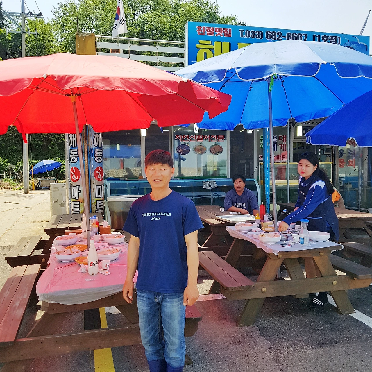 파라솔 아래여서 바알갛게 젖어버린 사진(위)이지만, 그 맛 하나는, '내가 지금까지 맛 본 물회 중 으뜸' 이었다. (참고로, 나는 물회를 무척 좋아한다.) 게다가, 친절한 주인 아저씨와 수줍은 우리 종업원 분. ^^ 맛있는 식사를 끝내고, 그냥 떠나기 아쉬워 사진 한 컷~! 지금도 그 물회를 맛 보러 다시 가고 싶은 곳이다. 대진항에 위치한 "해동횟집"이다.
