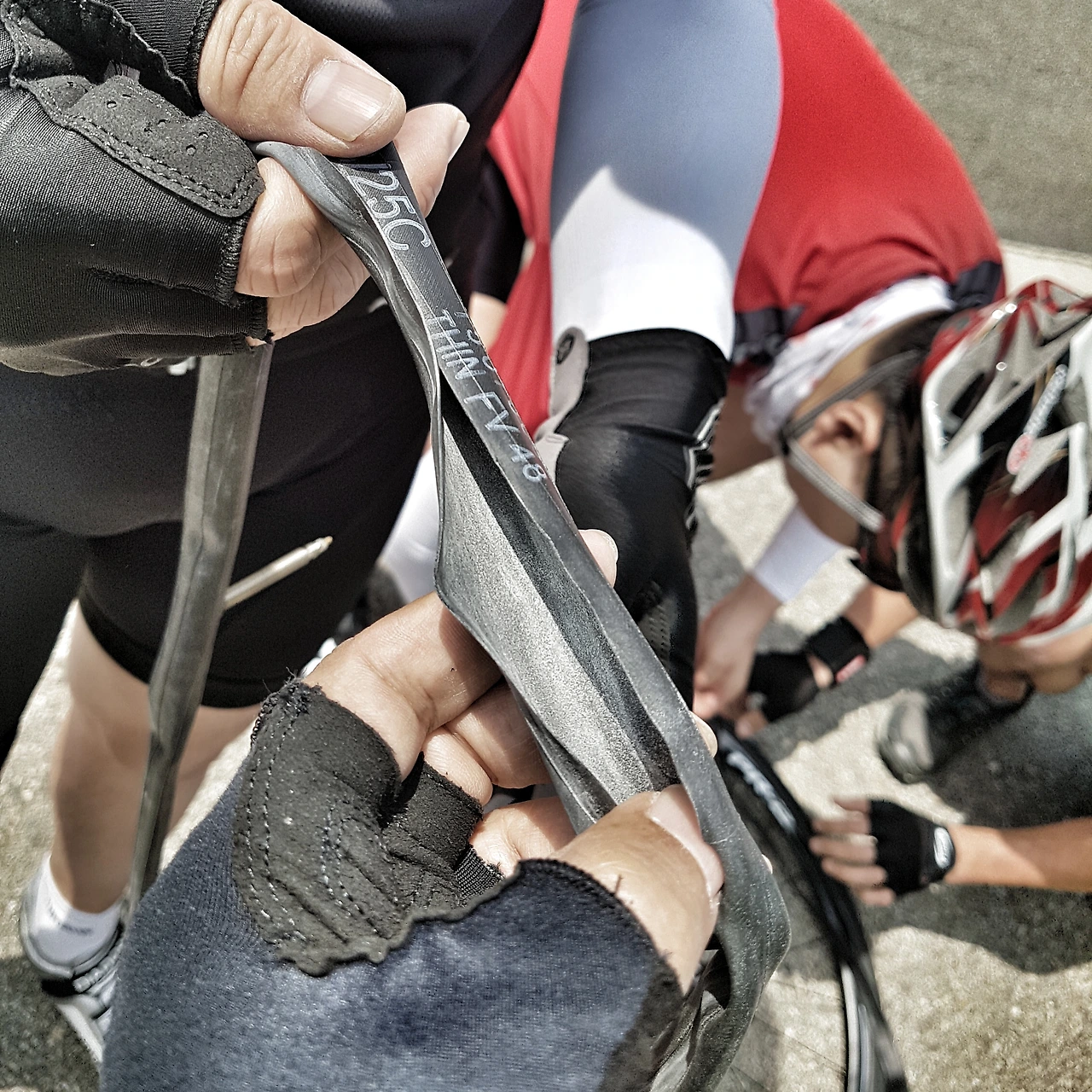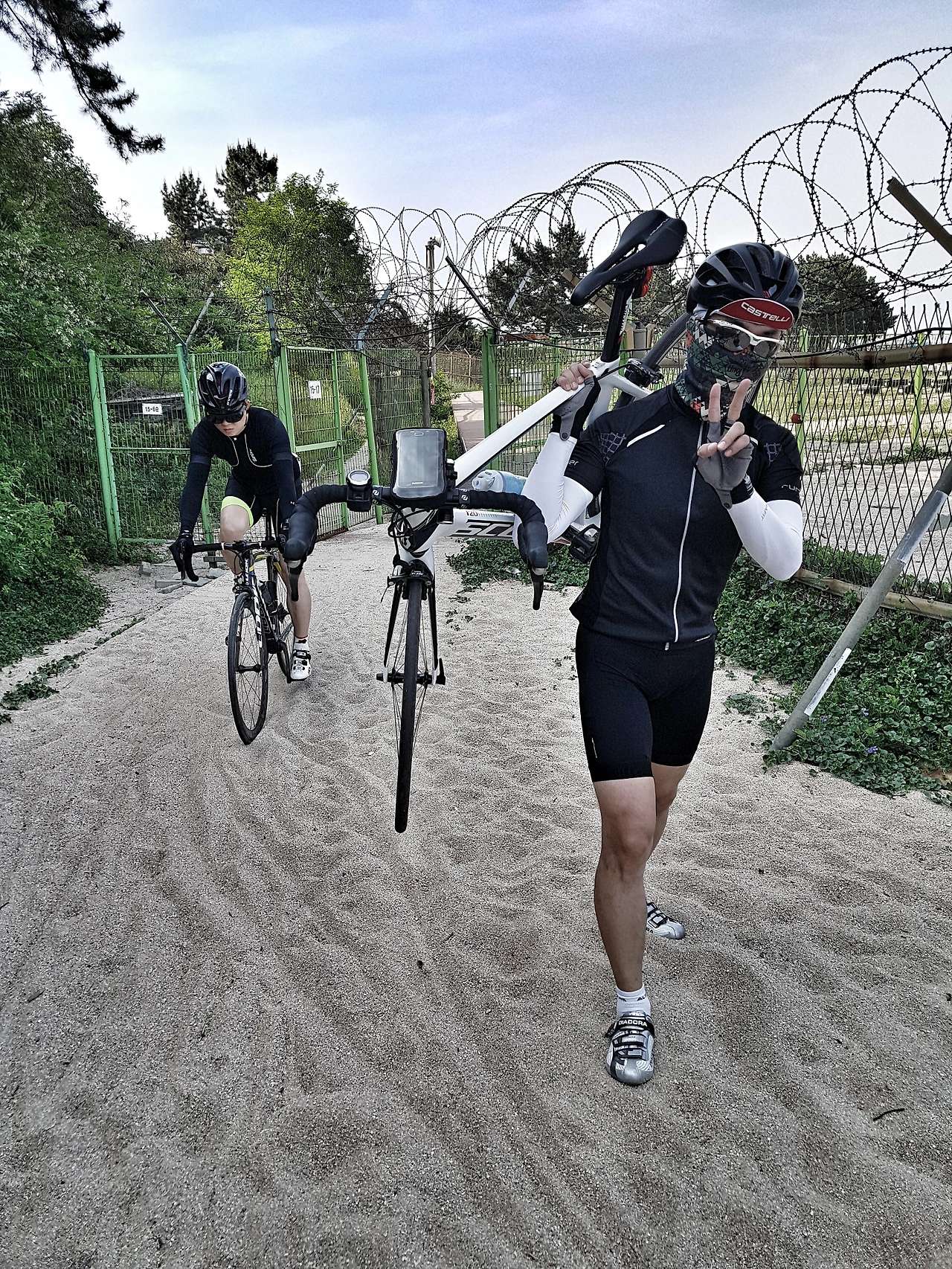 뭔가 큰 이벤트를 치르기 직전에 생기는 소소한 사고들을 우리는 '액땜'한다고 한다. 큰 일을 앞두고 조그만 일이라도 긍정적인 관점으로 보려했던 우리 어른들의 지혜였겠지만, 출발 후 30초(?)즈음 되었을까? 첫 펑크다. 오랜동안 MTB라이딩을 해오셨다는 권라이더. 첫 로드바이크를 구입하고 첫 라이딩에서 30초만의 펑크~. 요란한 신고식일 법도 한데 아무튼, 워낙 이번 라이딩엔 경험 많은 라이더들이 많아, 어렵지 않게 응급처치 후 다시 출발, 첫 인증센터이자 출발점인 통일전망대인증센터에 다달아 그 출발을 알린다.