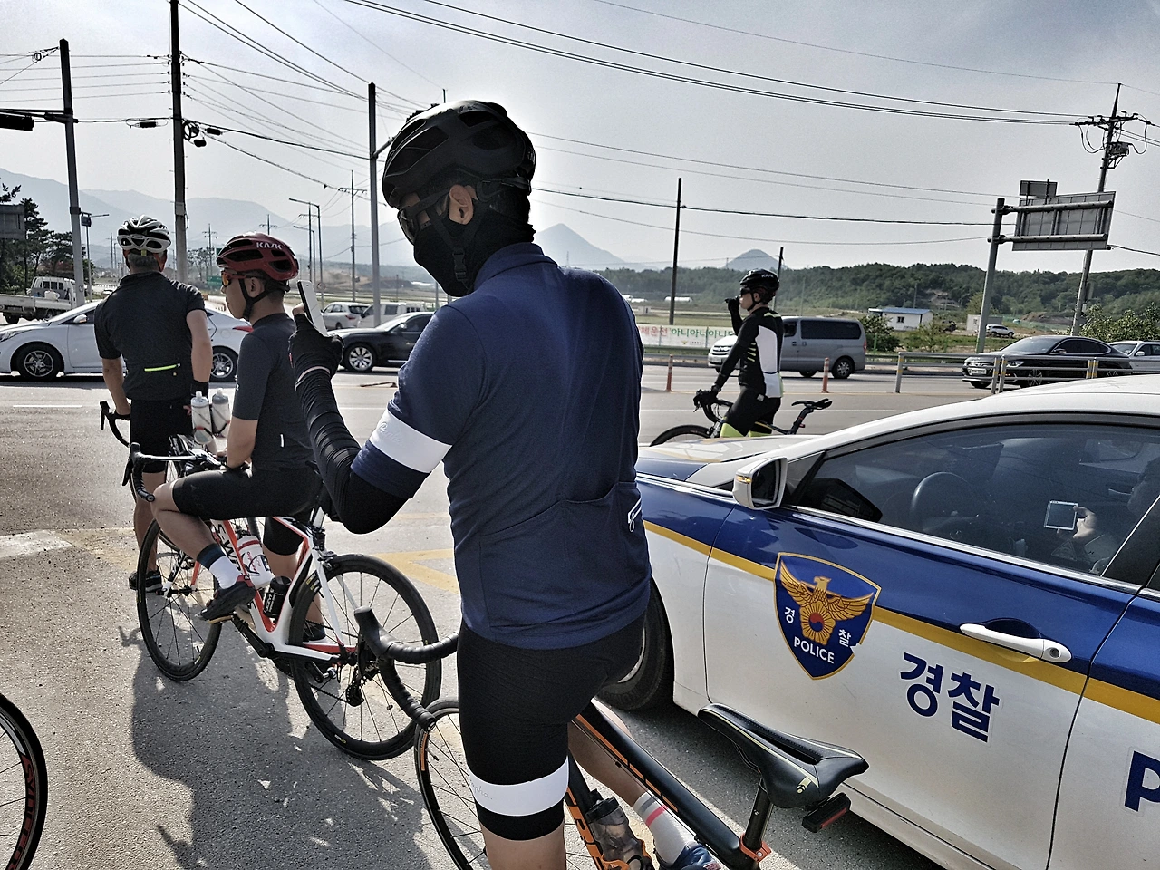 동해안자전거길은, 우리가 길을 잃은 것일 수도 있지만, 종종 해안도로를 벋어나 약간 내륙 쪽의 큰 도로를 타야하는 경우가 있다. 느낌으론, 제주도 보다 내륙 라이딩 비중이 높은 듯하다. 그래서, 더욱 안전에 신경을 써야한다. 봉포해변을 향하는 길이었던 것 같은데, 근무대기 중인 경찰차 옆에서 신호를 기다리니, 웬지 보호받는 느낌마저 든다. ㅎㅎ