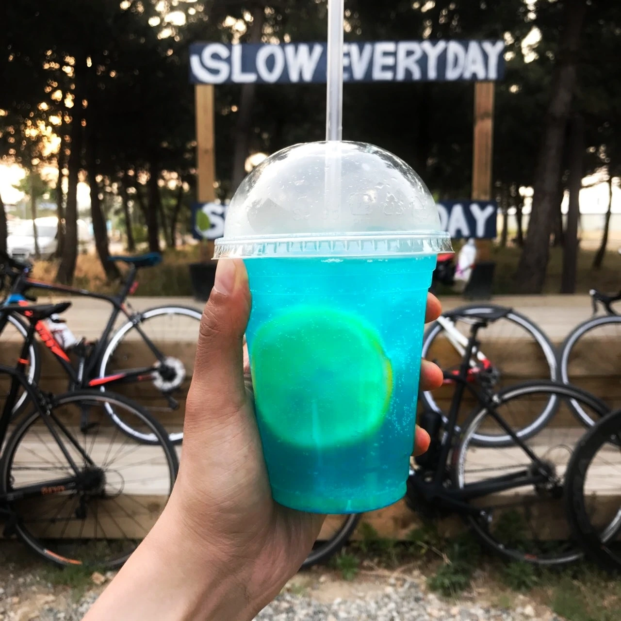 피곤한 근육을 쉬게 하면서 갈증까지 해소해주는 카페는 장거리 라이딩의 백미다. 시원한 커피와 물통에 얼음 보충까지~.