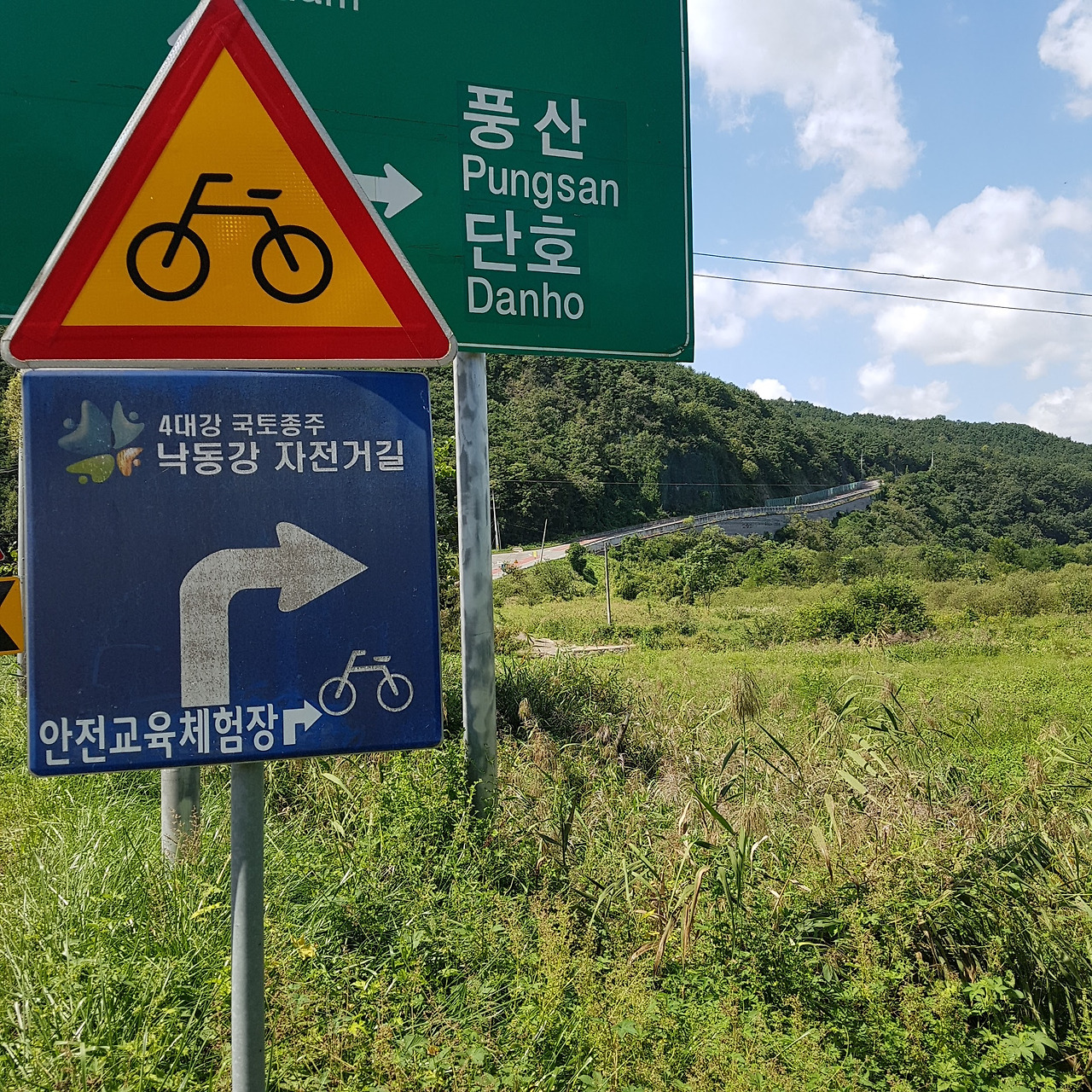 국토종주 자전거길에는 전용 이정표가 기대 이상 잘 되어 있다. 심지어 숲이 우거진 지역에선 진행방향 건너편에 설치하여 최대한 라이더의 시야에서 놓쳐지지 않도록 하는 지역 공무원들의 배려까지.