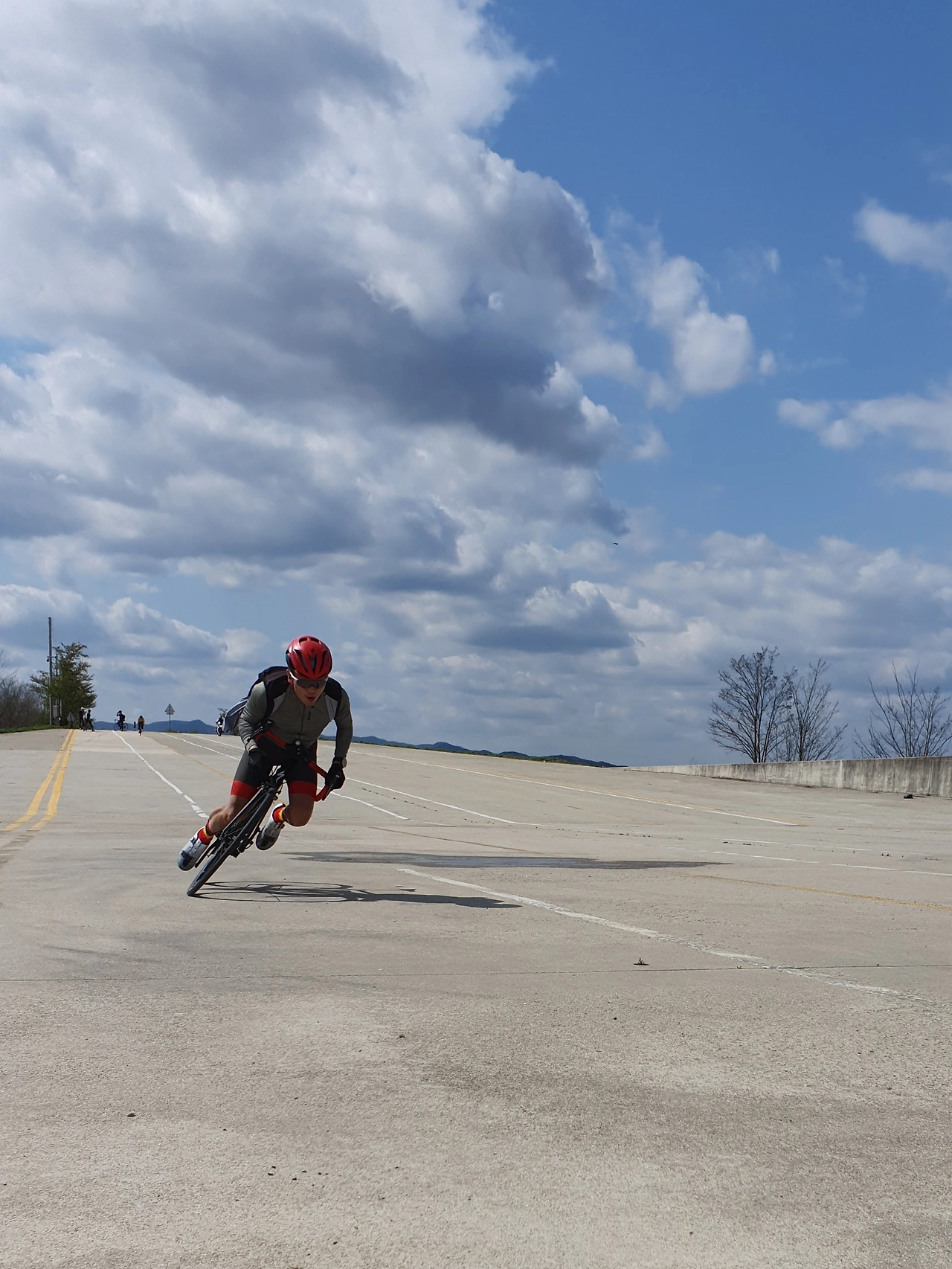 넓은 도로를 신나게 달리다 그만... 큰 부상을 입었다.너무 신이났고 해방감에 빠져든 나머지 잠시 흥분했었나보다. 지금은 회복 되었지만, 당시엔 꽤 큰 부상을 입었다. 전화위복이 되어, 안라(안전한 라이딩)의 중요성과 조심해야할 코스 특성들이나 상황에 민감해지긴 했지만, 안전에 대한 강조는 지나침이 없다.