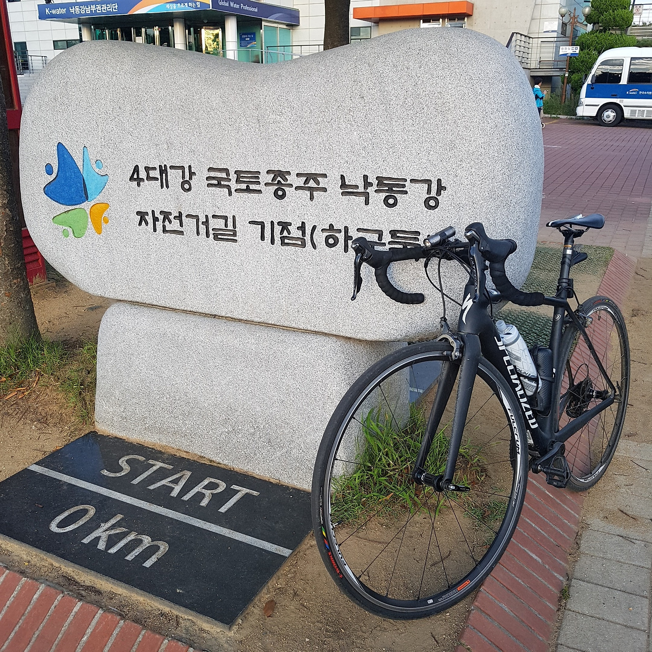 인증센터 바로 옆에는 "Start 0 Km"라는 국토종주 기점임을 알리는 표지석이 보인다.