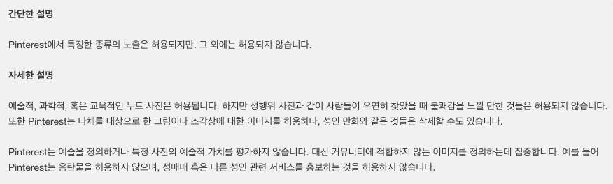 성적인 내용에 대해서는 주의할 필요가 있습니다. 컨텐츠 정책이 비밀 보드에도 적용되니까요. 예술적, 과학적, 교육적인 내용은 허용되지만 성행위 등이 담긴 적합하지 않은 컨텐츠는 삭제될 수 있습니다. - about.pinterest.com/ko/acceptable-use-policy