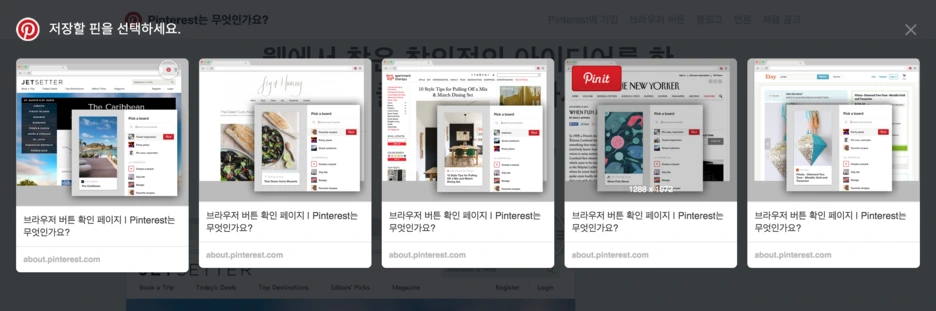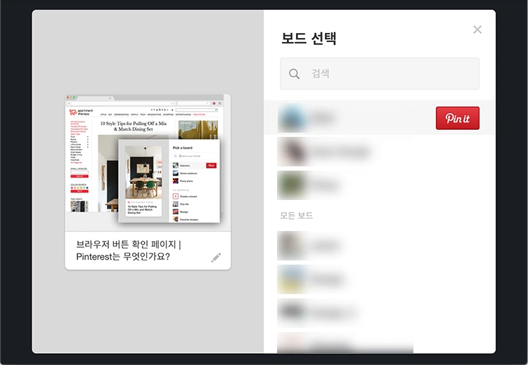 하지만 가장 간편한 방법은 핀 할 자료를 보는 대로 브라우저에서 바로 핀 하는 것이죠. 크롬, 파이어폭스, 사파리, 인터넷 익스플로러에서 브라우저 확장 도구를 설치하면 웹서핑 도중에 곧바로 컨텐츠를 핀 할 수 있습니다. Pin It 확장 도구 버튼을 누르거나 이미지를 우클릭해서, 혹은 확장 도구 설정에서 이미지의 한쪽 구석에 뜨도록 할 수 있는 작은 Pin It 버튼을 누르면 핀 추가 창이 뜹니다.