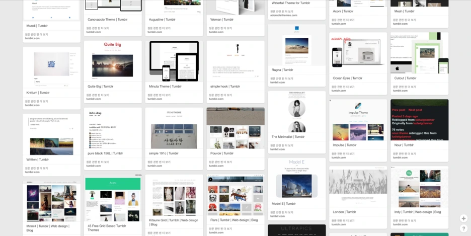 각 핀에서 '원문 관련 핀 더 보기'를 누르면 해당 출처에서 다른 사람들이 핀 한 이미지를 모아볼 수 있습니다. 예를 들자면 텀블러에서 핀 한 이미지의 경우 다른 사람들이 텀블러에서 핀 한 이미지들을 모아서 보여주는 식이죠.