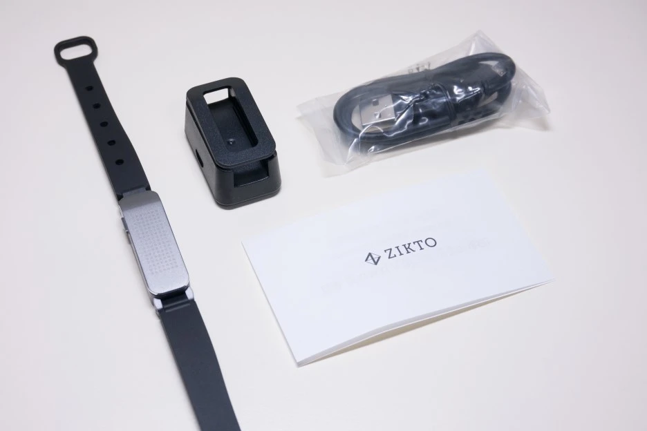 구성품은 직토 워크와 실리콘 스트랩, 충전용 크레들, 마이크로 USB 케이블, 간략한 설명이 적힌 종이입니다.