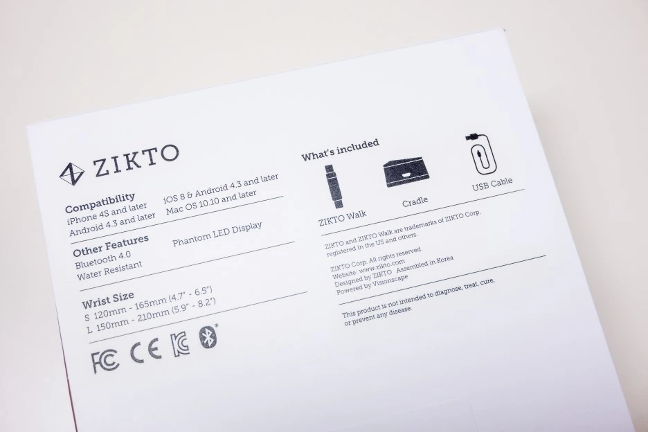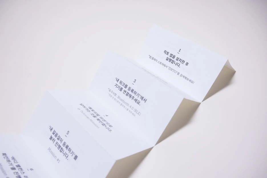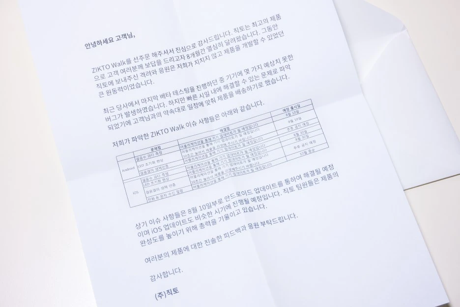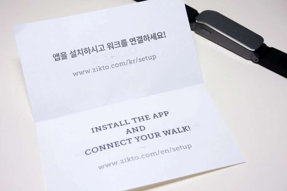 4등분으로 접힌 A4용지는 버그와 기능 추가에 대한 업데이트 안내입니다. 현재 안드로이드와 iOS 모두 해당되는 걸음 수 과다 측정과 LED 초기화 현상 버그가 해결될 예정이며 걸음걸이 생체 인증, iOS에서의 전화&문자 수신 알림 기능이 추가될 예정이라고 하네요. 업데이트는 ZIKTO 모바일 앱을 통해 이루어집니다.