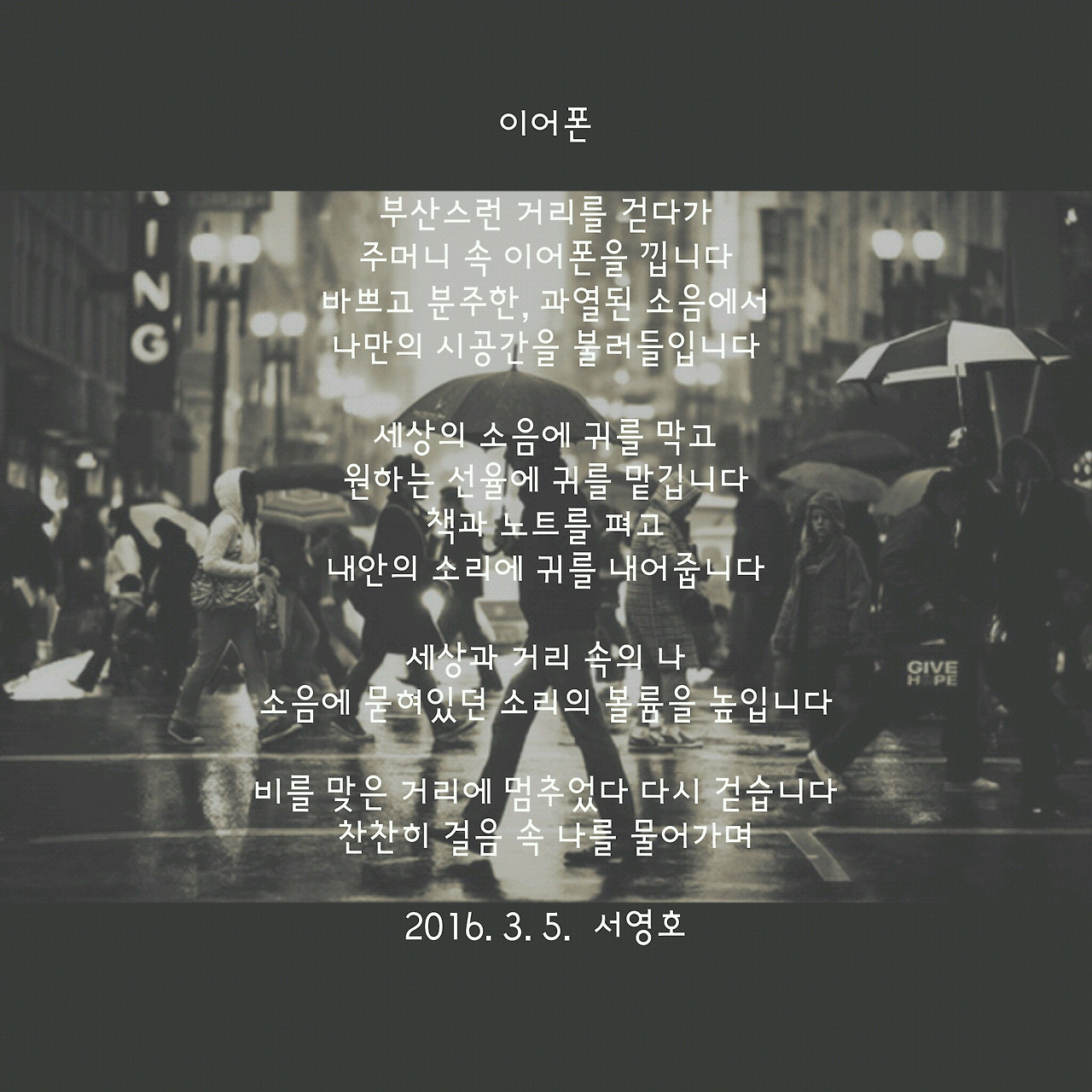 비를 맞은 거리에 멈추었다 다시 걷습니다