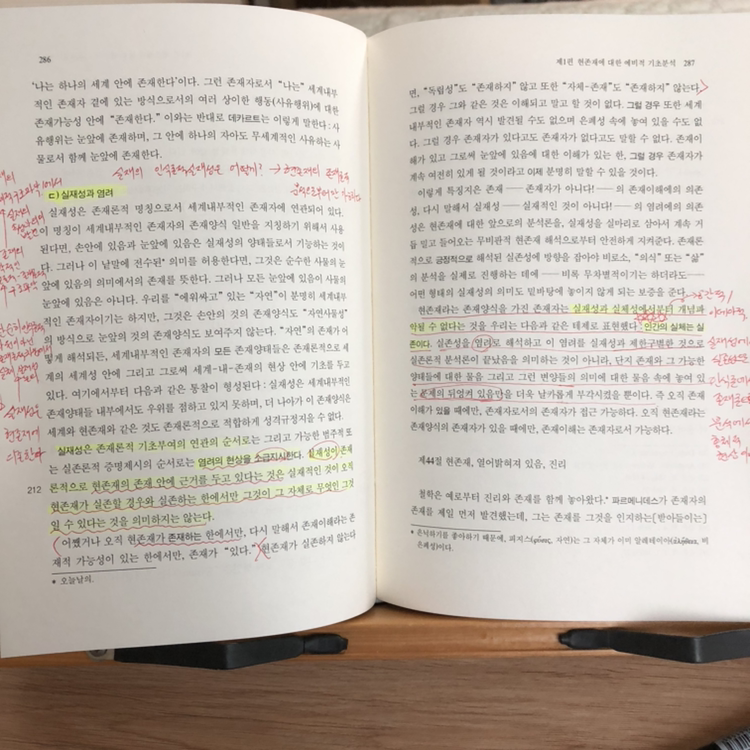 아직 반을 더 읽어야하지만, 이 책을 읽고자하는 분들에게 해줄 수 있는 조언은 ‘배경지식’, ‘바탕지식’이다. 철학의 어려움은 같은 용어를 두고도 철학자마다 다른 의미로 사용한다는 점이다. 예를 들어 칸트의 ‘현존(재)’와 자신의 ‘현존재’가 다름을 하이데거도 설명한다. 철학은 어쩌면 존재에 대한 철학자 나름의 규정이기에 같은 언어(표상)를 다르게 규정하는 것은 흔한 일이다. 그렇기에 <존재와 시간>을 읽으려면 기본적으로 데카르트, 칸트, 실존주의, 후설의 현상학에 대한 개념정리와 배경지식이 필요하다는 생각을 했다. 개념정리가 안되어있으면 오독과 난독 증상을 충분히 일으킬 수 있다.(물론 나도 여기서 예외는 아니다.)
