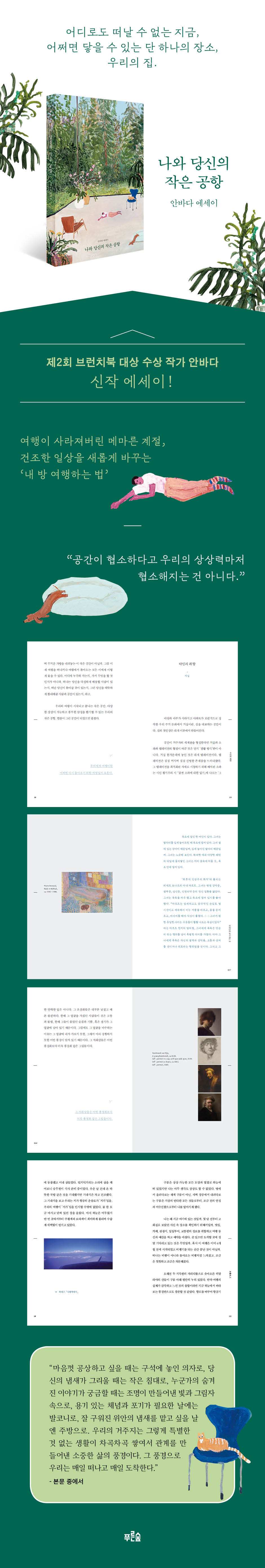 <나와 당신의 작은 공항>의 표지 그림은 이지은 작가님의 회화 작품입니다. ( https://www.instagram.com/lee_eun24/ ) 가만히 보고 있으면, 느긋하게 힐링이 되는 그림입니다. 잘 디자인된 종이책이 주는 물질성의 느낌은 다른 무엇과도 바꾸기 힘들지 않나, 라는 생각을 하게 만드는 디자인의 책입니다. <나와 당신의 작은 공항>이 답답하고 우울한 지금, 작지만 따뜻하고 소박한 위안을 줄 수 있으면 좋겠습니다.