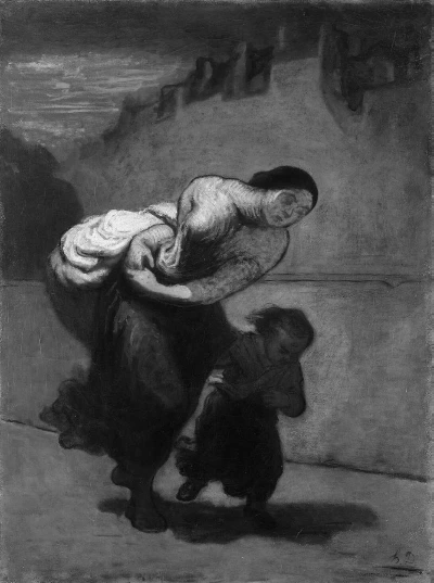 풍자 화가였던 도미에. 그는 인물의 특징을 잡아내고 상황을 강조하는 방식을 알았다. 여인에게 다급히 떨어진 빛은 인공조명처럼, 뛰어가는 여인의 신체와 몸짓, 그리고 무거운 짐을 인상적으로 비춘다. 여인 옆의 아이는 그림자가 만든 어둠 속에 가려있다. 그런데 내게 그 빛이 강조하는 것이 여인이나 여인의 짐이라기보다 여인의 그림자에 갇힌 아이 같다는 생각이 들었다. 빛을 받고 있는 여인과 달리 아이는 여인의 그림자 안에 온전히 갇혀 있어서 자세히 보지 않으면 얼굴이 잘 보이지 않는다.