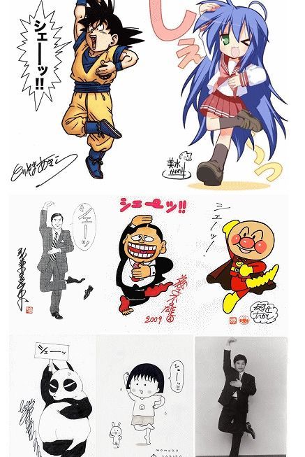 사실 일본인들이 사진을 찍을 때 하는 자주 하는 이 포즈는 1960년대 일본에서 유행한 赤塚不二夫 씨의 만화 오소 마츠군『おそ松くん』의 등장인물인 이야미「イヤミ」가 행하는 개그 동작입니다. 일반적으로 놀랐을 때 이러한 동작을 취하면서 「シェ-」라고 말을 합니다.