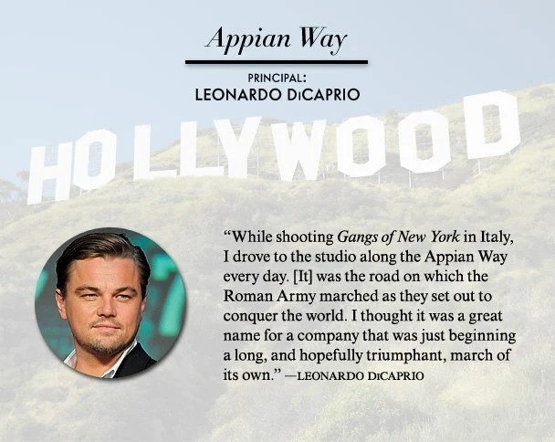 레오나르도 디카프리오의 영화제작사의 이름은 이태리에서 영화를 찍을 당시 고대 로마군이 세상을 정복하기 위해 행진했던 Appian Way라는 이름의 거리를 발견하고 자신의 제작사도 승승장구하는 마음에서 거리 이름을 그대로 따왔다고 합니다..
