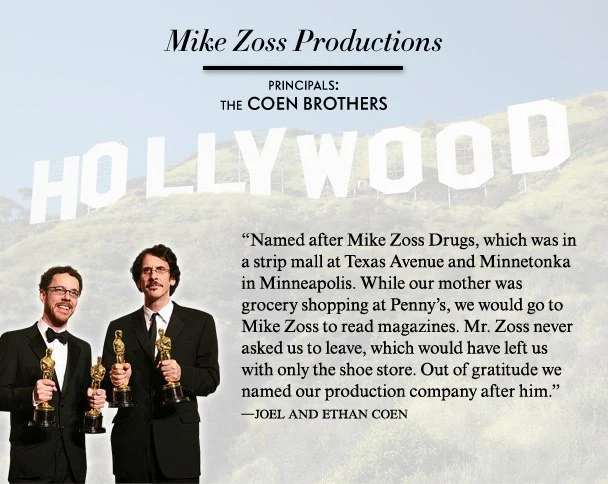영화[파고]로 아카데미상을 휩쓴 코헨 형제의 제작사 MIKE ZOSS는 자신들이 어릴 때 어머니를 따라간 MIKE ZOSS약방의 이름에서 따왔다고 합니다.