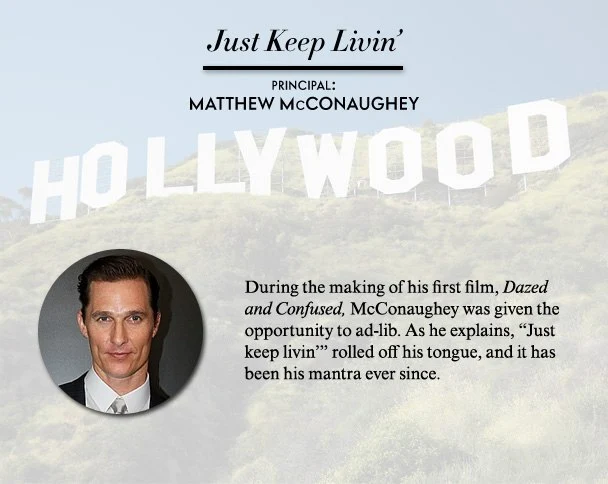 배우 매튜 맥커너히는 자신의 첫 영화 속 애드리브이었던 "Just Keep living"이라는 대사가 그의 평생 생활 속 만트라[주문]가 되어 버렸는데 영화제작사도 똑같이 그렇게 붙였다.