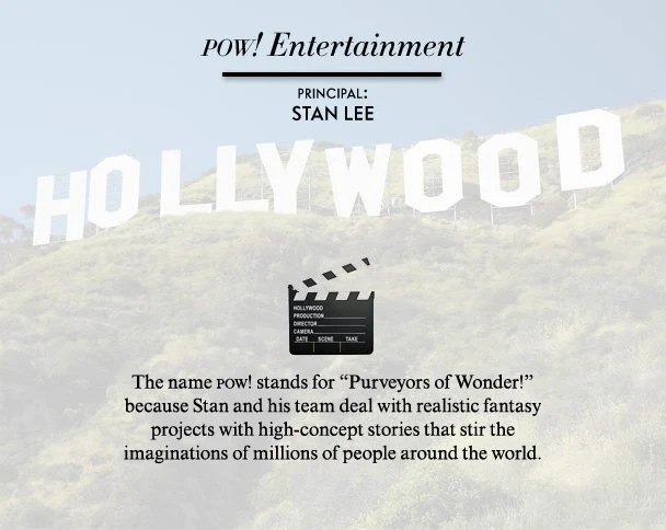 스파이더맨과 아이언맨을 탄생시킨 스탠리의 영화제작사 이름은 POW!입니다. 놀라운 것을 가져다주는 제공자들 [Purveyors of Wonder]의 약자인데 온세계 사람들의 상상력을 충동하는 하이콘셉트 스토리와 리얼 같은 환타스틱 영화를 추구하는 그의 제작방향을 잘 나타내는 이름이라고 합니다.