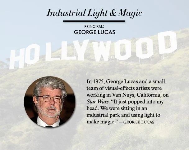 1975년 조지 루카스는 캘리포니아주의 밴나이스 시에서 자그마한 영화특수효과팀에서 일을 했었는데 하루는 인더스트리얼 Industrial이라는 공원에서 있다가 자신이 조명 빛을 이용하여 환상적 마술을 창조해내고 있다는 생각이 들어 후에 자신의 제작사 이름도 인더스티리얼 , 라이트 앤 매직으로 지었다고 합니다.