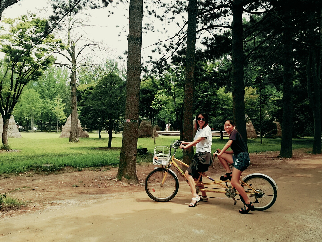 커플 자전거는 앞사람이 기본적으로 힘이 좋아야 하겠지만 뒤에서도 같이 보조를 맞춰줘야 앞사람이 힘이 덜 든다