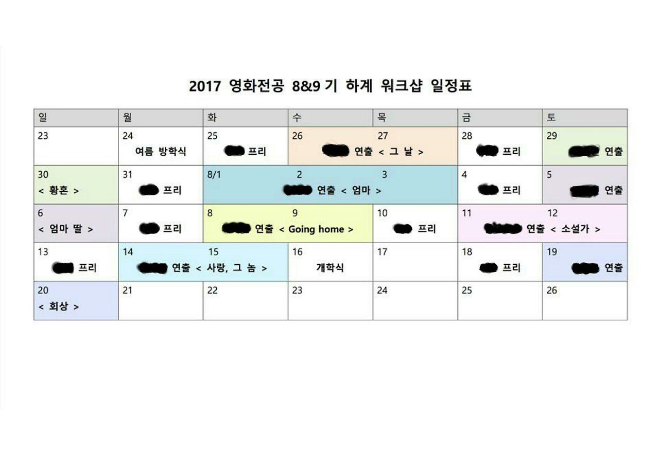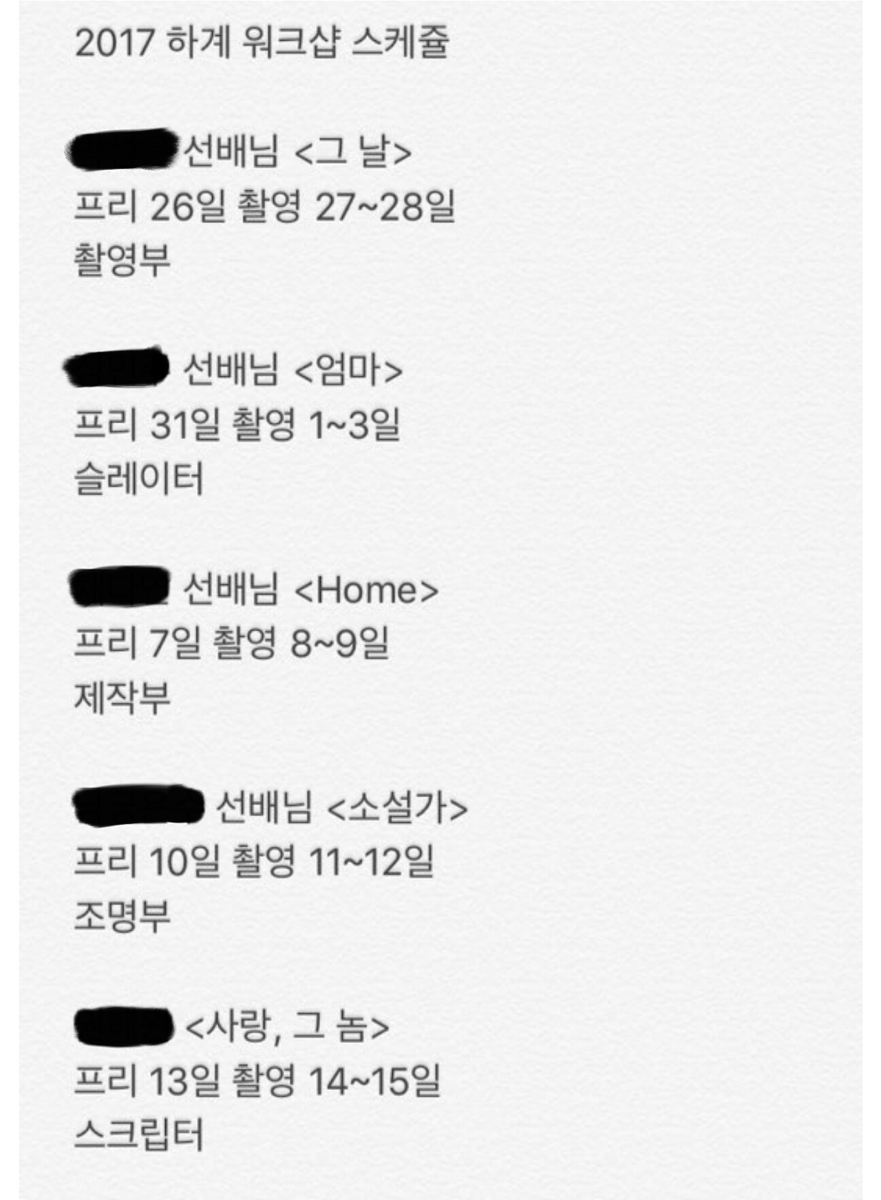각자 원하는 영화와 부서를 신청해서 조를 짜는데 인원이 적으니 한 사람이 스태프로 참여해야 하는 영화가 평균 5편 정도 된다