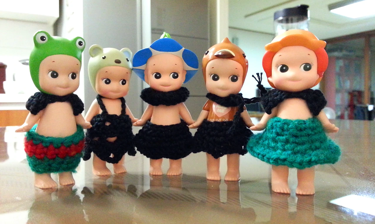 녀석의 인형마다 뜨개옷을 해 입혔다