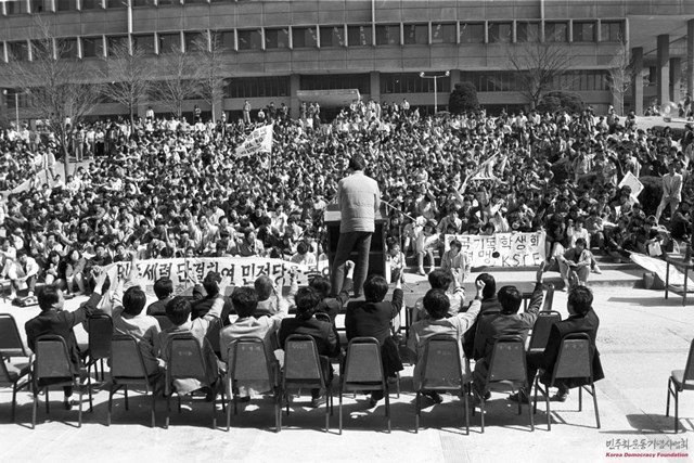 “반전반핵 양키고홈”, “미제의 용병교육 전방입소 반대”를 외치며 분신한 김세진, 이재호 열사의 2주기 추모식 및 자주통일범국민결의대회가 진행중인 서울대 아크로폴리스 광장 (1988. 04. 28)