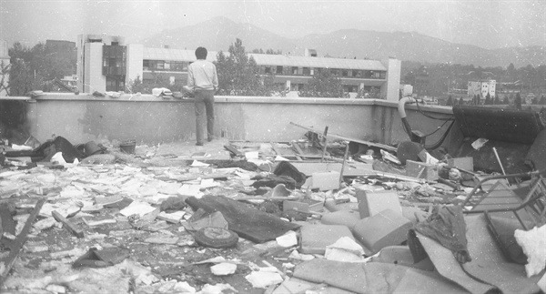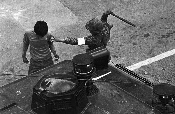 이즈음 10월 28일, 건대 항쟁 사건이 일어납니다. 2000명의 학생들은 자민투와 민민투로 나뉜 학생운동을 통일하자는 취지에서 설립된 전국반외세반독재애국학생투쟁연합(애학투련) 결성식을 건국대에서 진행한 뒤 귀가 준비를 하고 있었습니다. 평상시와 달리 대학가에서는 검문조차 없었죠. 그 순간, 경찰의 토끼몰이식 진압이 시작됩니다. 학생들은 경찰에 쫓겨 캠퍼스 건물로 들어가고 안전 귀가 보장시 자진해산하겠다고 했지만 경찰은 자수를 요구합니다. 이후 이 사건은 정부에 의해 ‘공산혁명분자 건국대 점거난동사건’이라 발표됩니다.