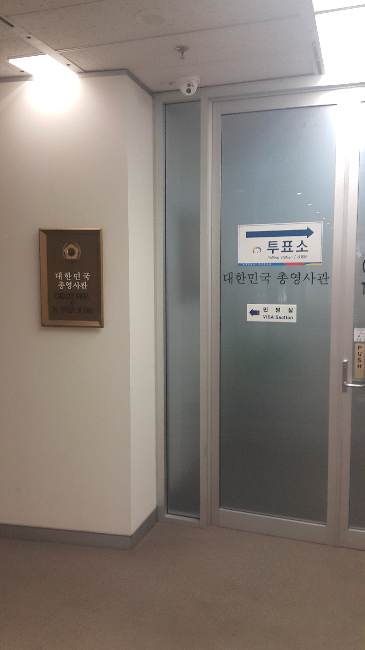 건물 안으로 들어가 입주목록을 확인하니 13층에 있다. 엘레베이터를 타고 올라간다. 재외국민 투표를 하고 있다. 민원실을 찾아들어갔다. 6대의 컴퓨터와 TV, 그리고 상담 창구. TV는 KBS world가 틀어져 있다.