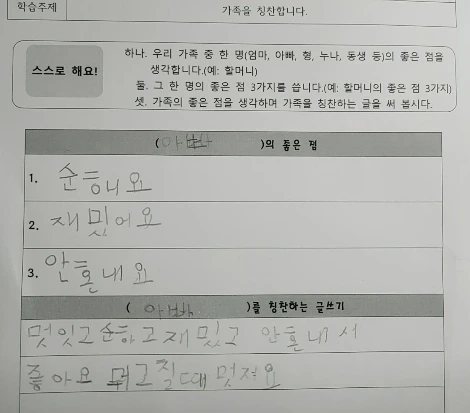 오늘 반짝이 학교 숙제는 <가족을 칭찬하는 글쓰기>다.