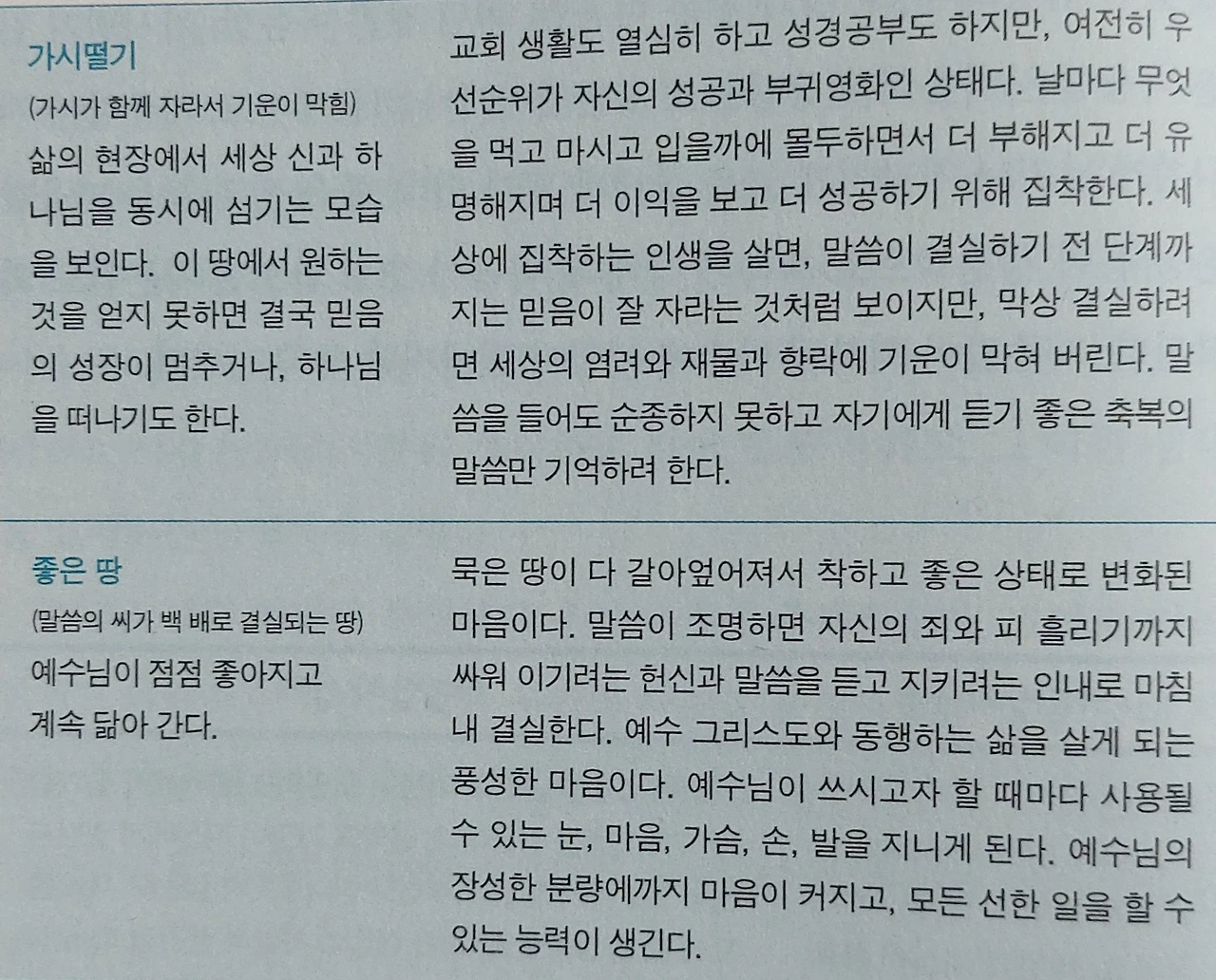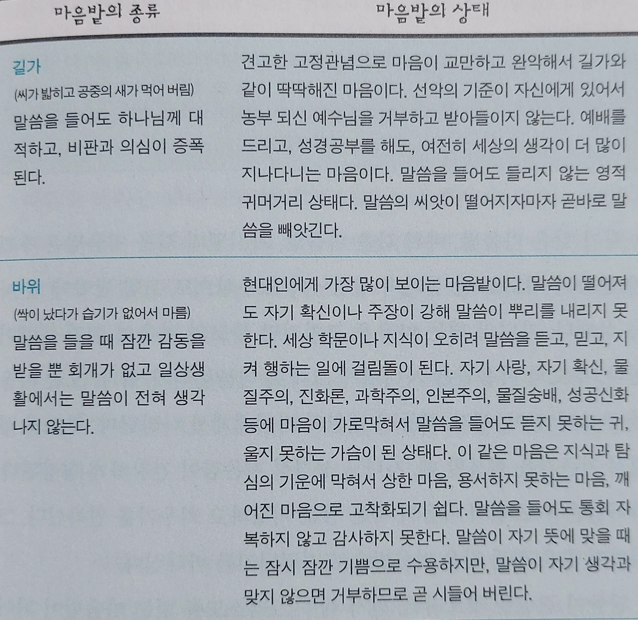 예수께서 비유로 말씀하시되 씨를 뿌리는 자가 그 씨를 뿌리러 나가서 뿌릴새 더러는 길가에 떨어지매 밟히며 공중의 새들이 먹어버렸고 더러는 바위 위에 떨어지매 싹이 났다가 습기가 없으므로 말랐고 더러는 가시떨기 속에 떨어지매 가시가 함께 자라서 기운을 막았고 더러는 좋은 땅에 떨어지매 나서 백 배의 결실을 하였느니라 이 말씀을 하시고 외치시되 들을 귀 있는 자는 들을지어다(눅8:4-8)