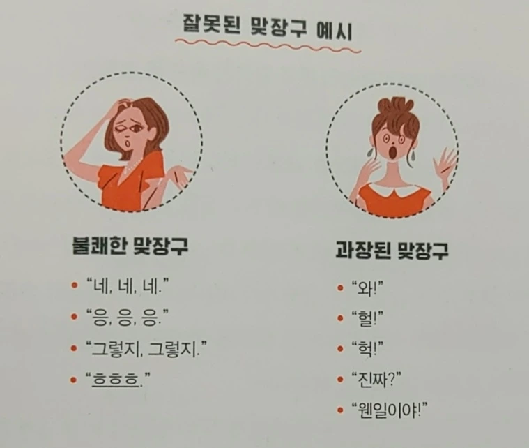 - "응, 응, 응..." 같은 말을 계속 반복하는 맞장구는 피해야 합니다.