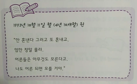 그리고 나머지 10퍼센트는 아이가 하는 말을 써주면 깨끗이 마무리된다. 그래서 아이가 화냈던 일, 엄마에게 거침없이 대들고 반항했던 일을 글로 써주는 건 특히 효과가 크다. 시간이 지난 다음 말일 기를 읽어주거나 스스로 읽을 때 아이는 비시시 웃는다. 자기감정을 잘 다스리지 못한 게 부끄러워서다