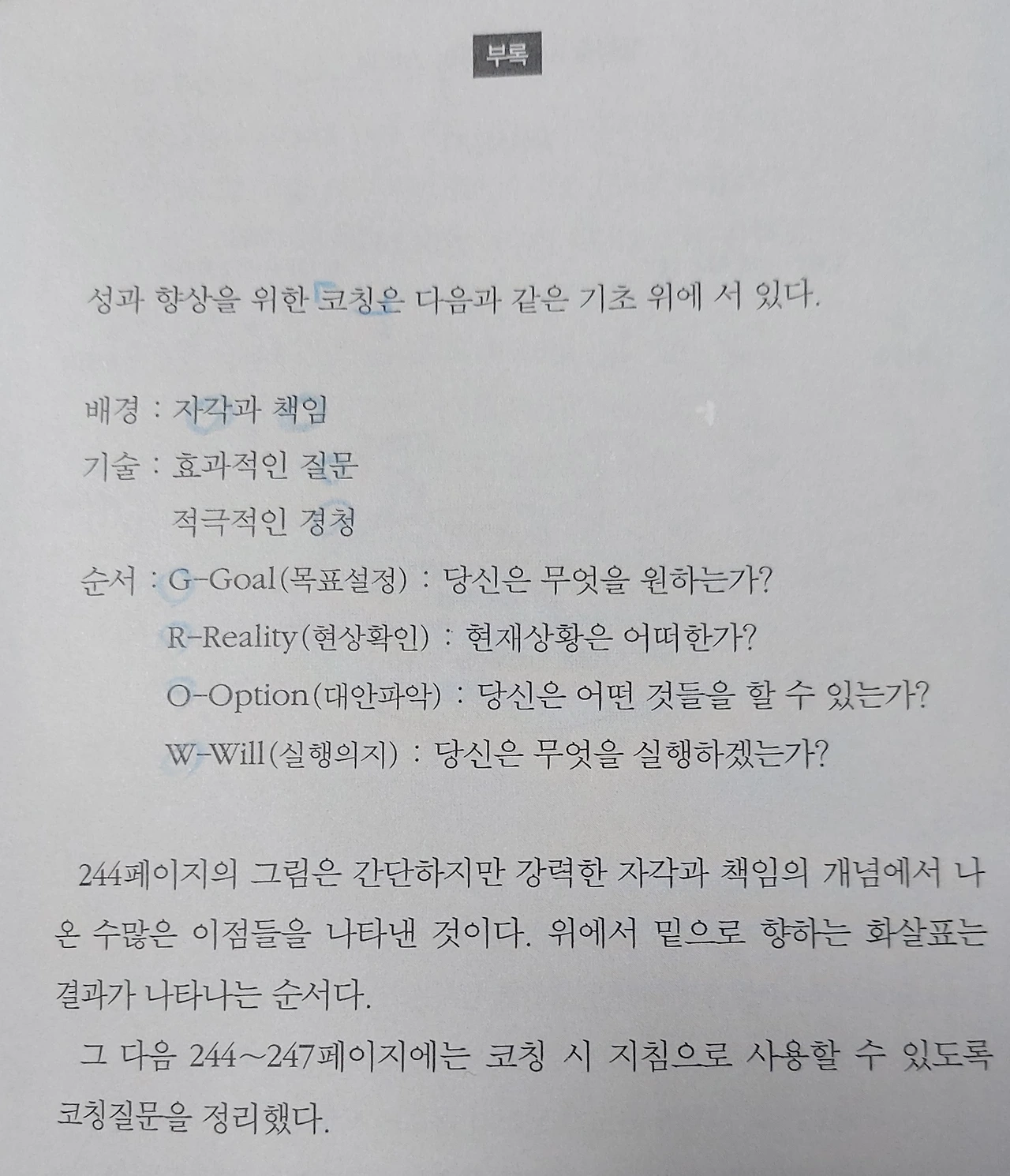 "언제, 어디서 문제가 생겼는지 확인해보십시오"라는 관리자의 함축성 있는 말속에는 코칭의 두 가지 핵심 원칙인 자각과 책임에 관한 내용이 들어 있다. 이 짧은 대화에서 관리자는 책임을 묻거나 화를 내는 대신 파트너의 역할을 해주었고, 수잔이 스스로 문제를 해결하게 했다 (26페이지)