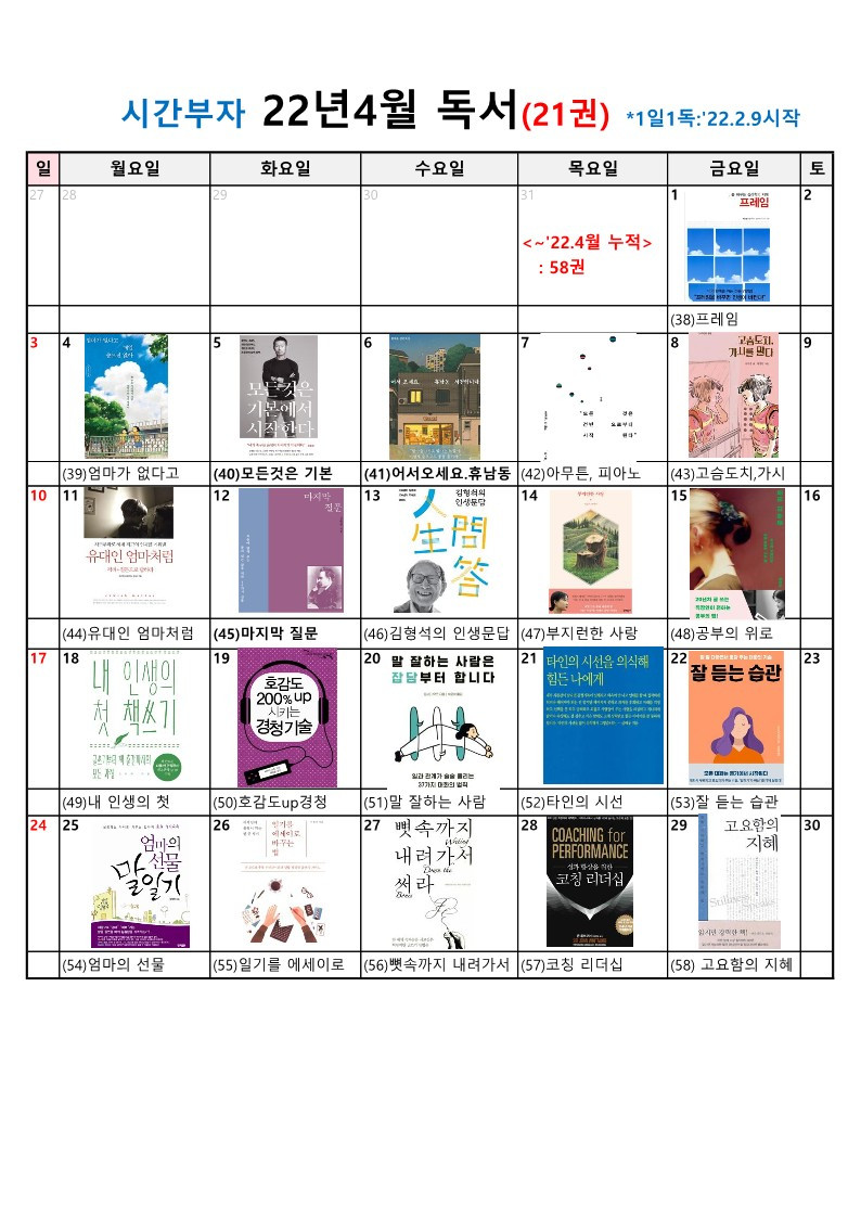 < 4월, 나의 베스트 >1. 모든 것은 기본에서 시작한다(손웅정)2. 어서오세요, 휴남동 서점입니다(황보름)3. 마지막 질문(김종원)4. 뼛속까지 내려가서 써라(나탈리 골드버그)
