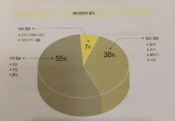 상대방으로부터 받아들이는 이미지 중 50% 이상이 표정이나 태도 같은 '시각 정보'로 구성되어 있고 의미를 담은 '언어 정보'는 7%에 불과하다