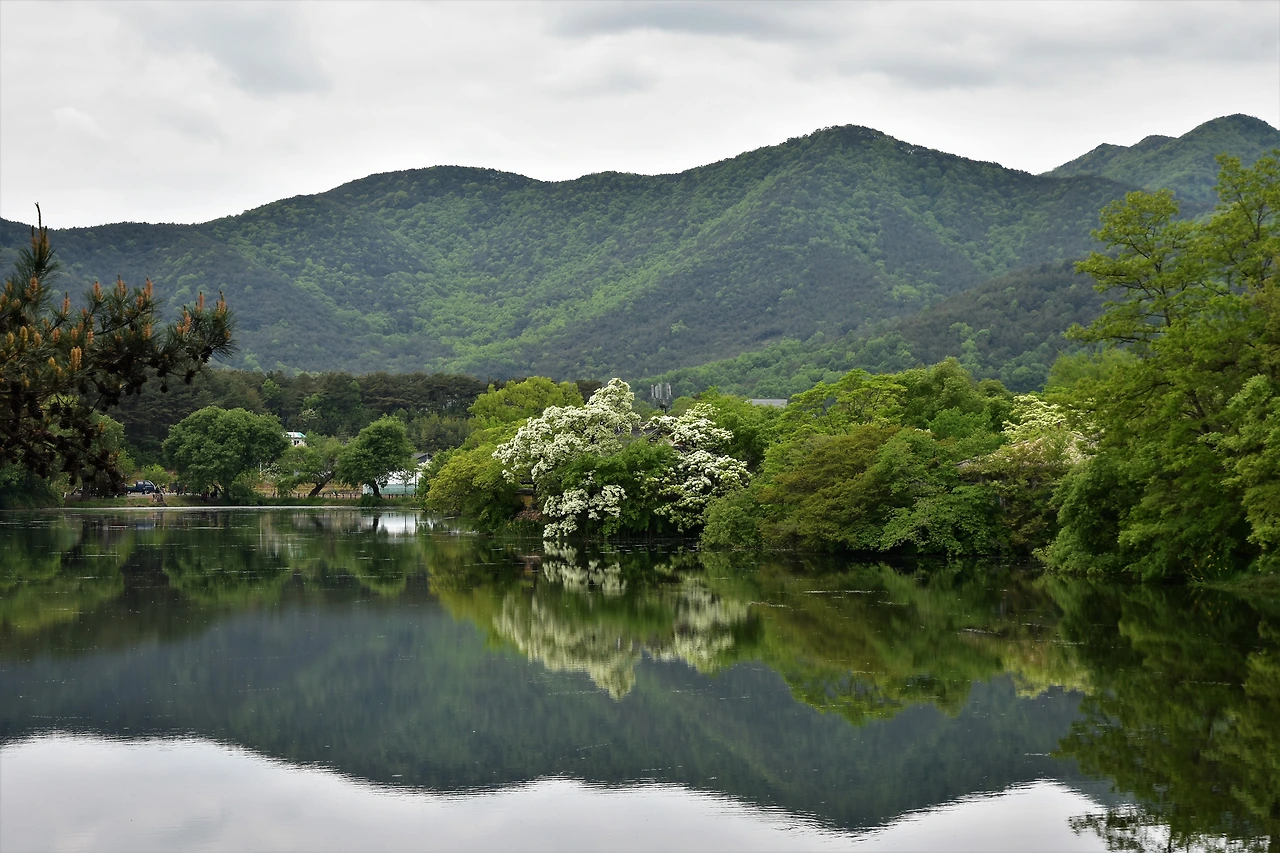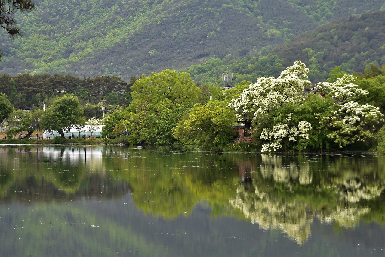 유난히 조용한 봄날 위양지 이팝나무 꽃의 반영도 잘 보인다.