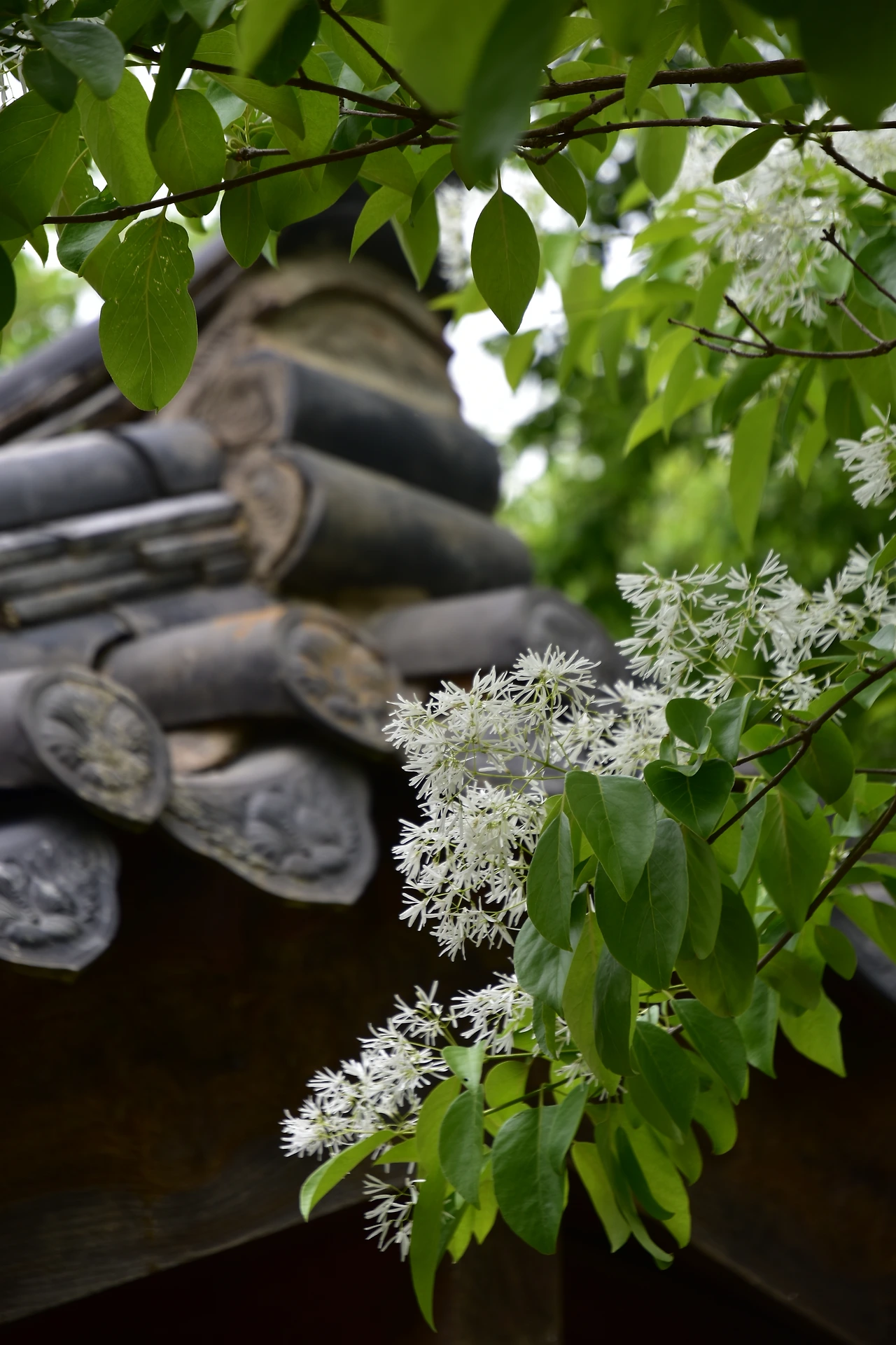 완재정 기와 지붕에 어린 하얀 이팝나무 꽃