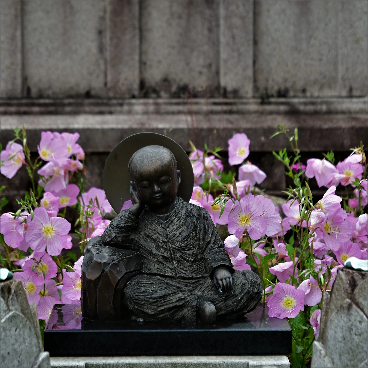 동자 스님이 잠시 꽃밭에서 편안하게 졸고 있다. 부처님의 자비와 평온함이 깃들어진 듯하다.