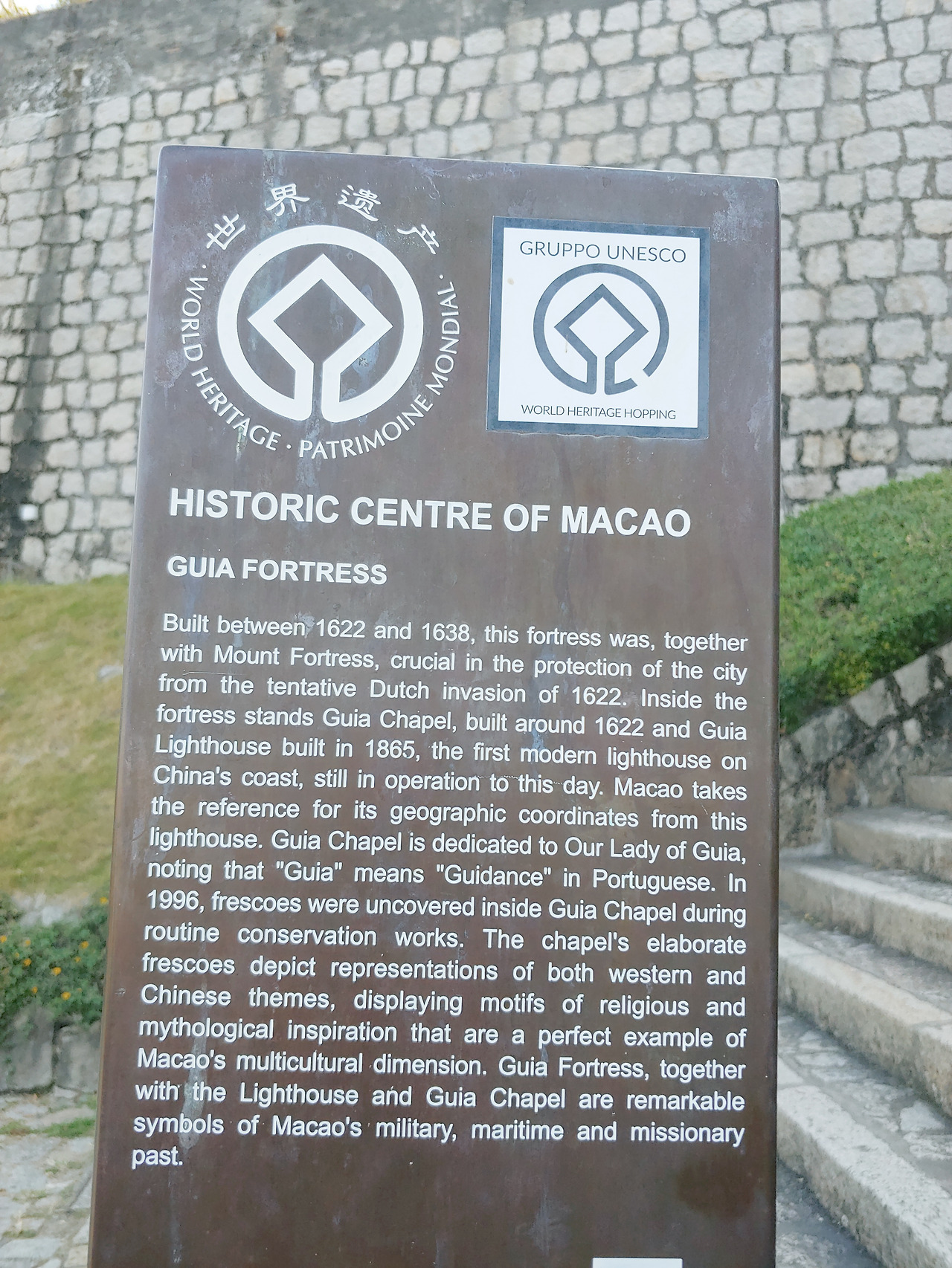첫 목표 지점인 기아 요새(Fortaleza da Guia, Guia Fortress)는 마카오에서 제일 높은 기아 언덕에 있다(94m). 마카오 반도 가장 높은 곳에 있어 중요한 군사기지로 사용되었다고 한다. 기아 산은 금산, 송산으로도 부르는데, 기아(Guia, 안내)라는 이름은 예전에 포르투갈 선박들이 풍랑을 만나 배가 전복될 위기에 있었는데, 산 정상에서 비추는 빛을 보고 무사히 항구로 갈 수 있었다는 이야기에서 유래되었다. 살아남은 선원들이 이는 성모의 은총이라 생각하고 빛이 나온 산 언덕에 작은 성당(Capela de Nossa Senhora da Guia)을 짓고 기아 성모께 봉헌하였다고 한다.