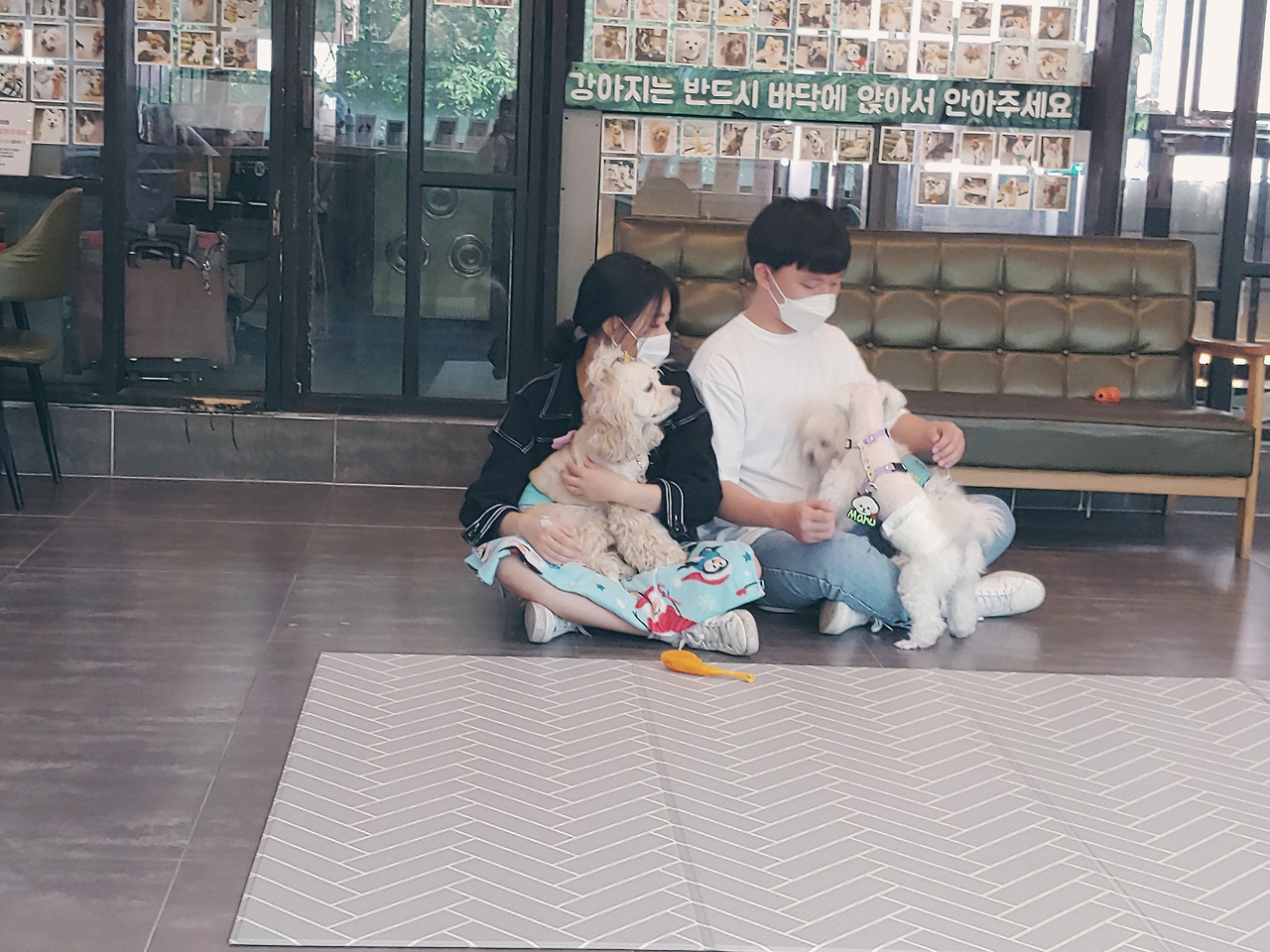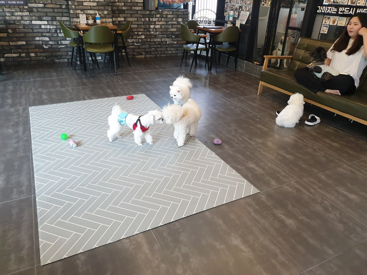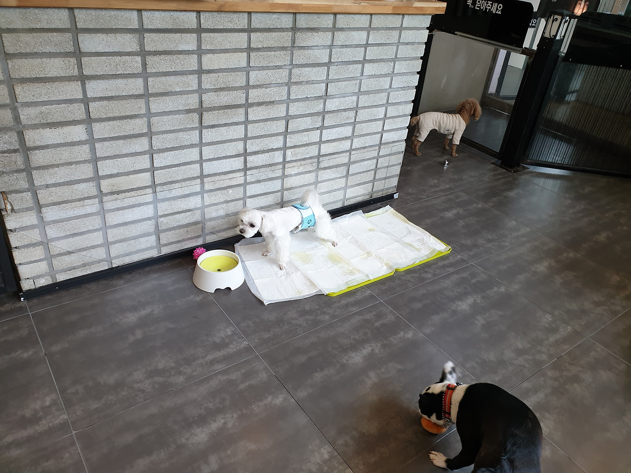 "마루가 작아서 그렇지 여기 아이들도 큰 개는 아니에요. 저희들은 13키로그램 이하 아이들만 입장할 수 있어요." 하신다. 하는 수없이 마루를 맡겨두고 잘 부탁한다는 말만 수 없이 하고 떨어지지 않는 발걸음을 옮겼다. 애견 카페에서는 10 분에 한 번씩 마루가 노는 모습을 사진으로 찍어 보내주셨다. 심지어 다른 애들에게 하도 들이대서 잠시 격리시켰다는 것도 알려주셨다.